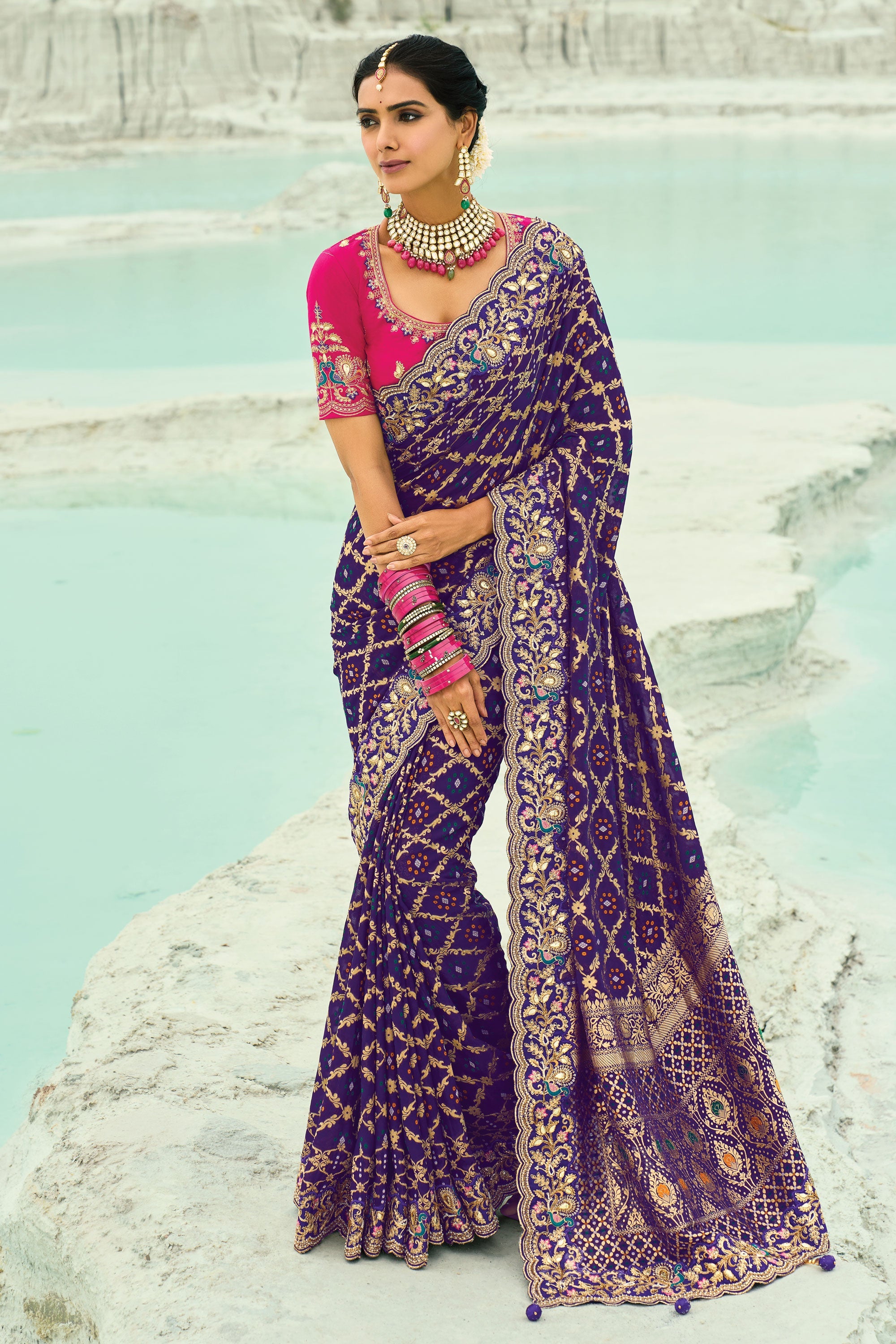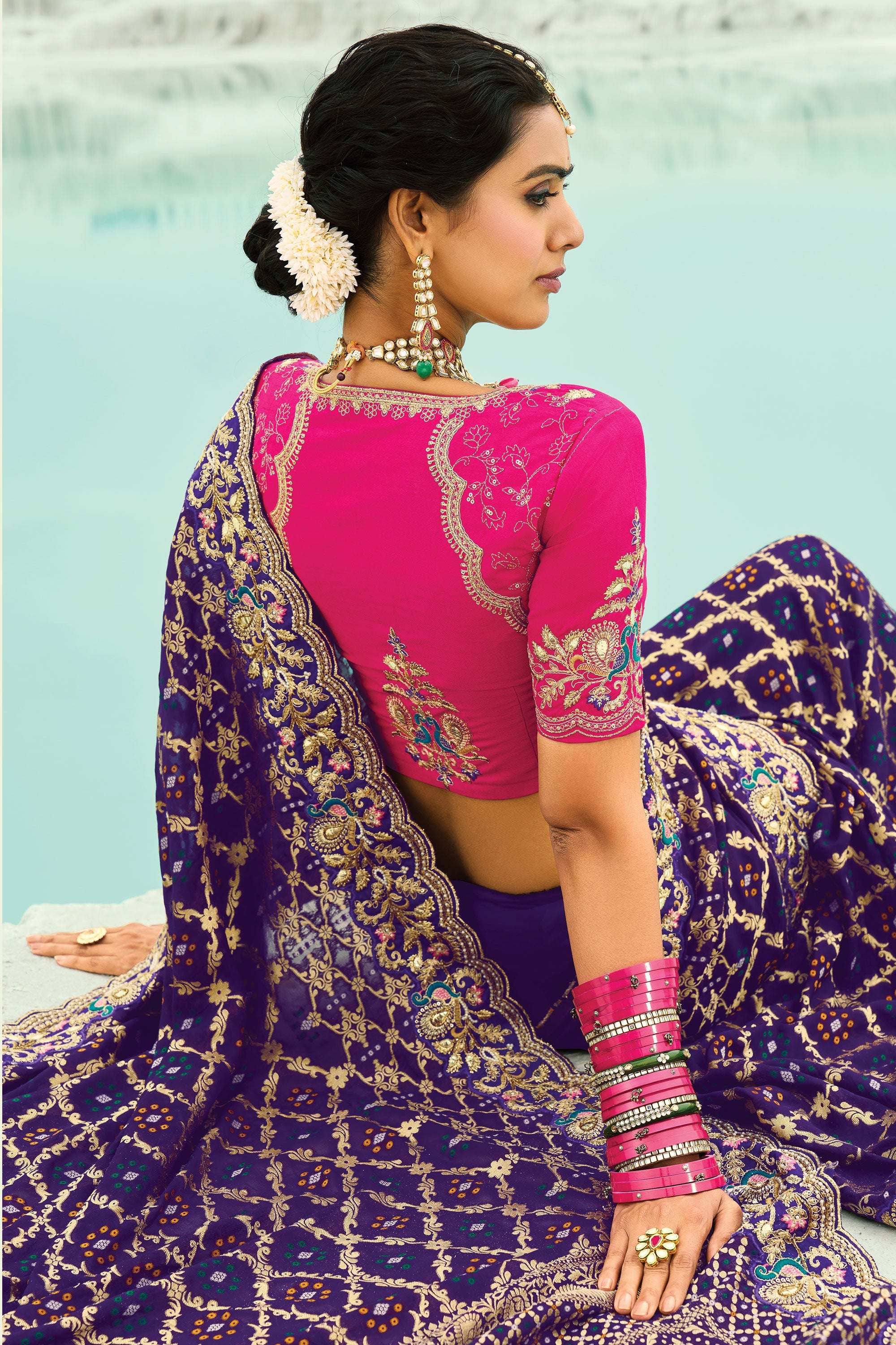 Exclusive Purple Georgette Bandhani Saree With Hand Embroidered Heavy Border