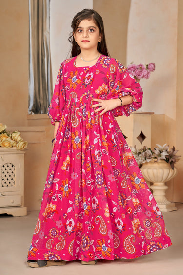 Let your kid make a stunning entry with our Gorgeous Georgette Fabric Readymade Gown designed for function wear. The vibrant print and sleek silhouette make this dress an attention-grabber. Meticulously tailored to offer the best fit, your child will revel in the comfort and flexibility of this garment during their special event. Ideal for various occasions, this gown ensures your kid is the star of the show. Opt for our unique kids gown, where fashion meets comfort!