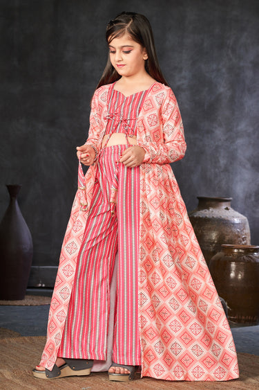 Pink Color Rayon Fabric Function Wear Readymade Kids Indo Western Palazzo Set With Digital Printed Shrug
