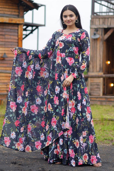 Navy Blue Color Elegant Digital Printed Georgette Gown with Dupatta