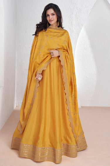 Silk Fabric Yellow Color Embroidery Work Designer Readymade Anarkali Gown With Dupatta