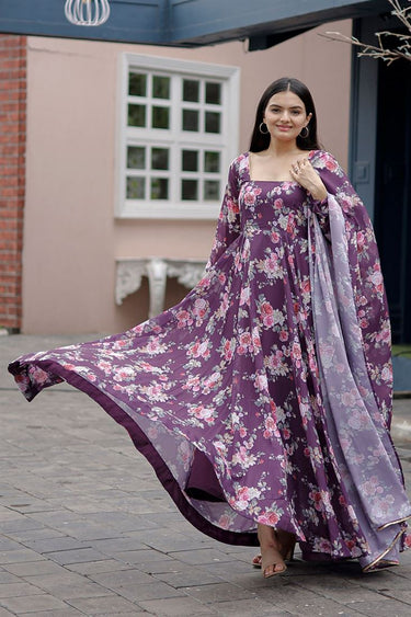 Vibrant Festivities Digital Printed Georgette Gown with Dupatta In Purple Color