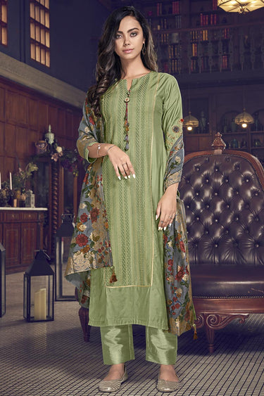 Art Silk Fabric Festive Wear Embroidered Salwar Suit In Green Color