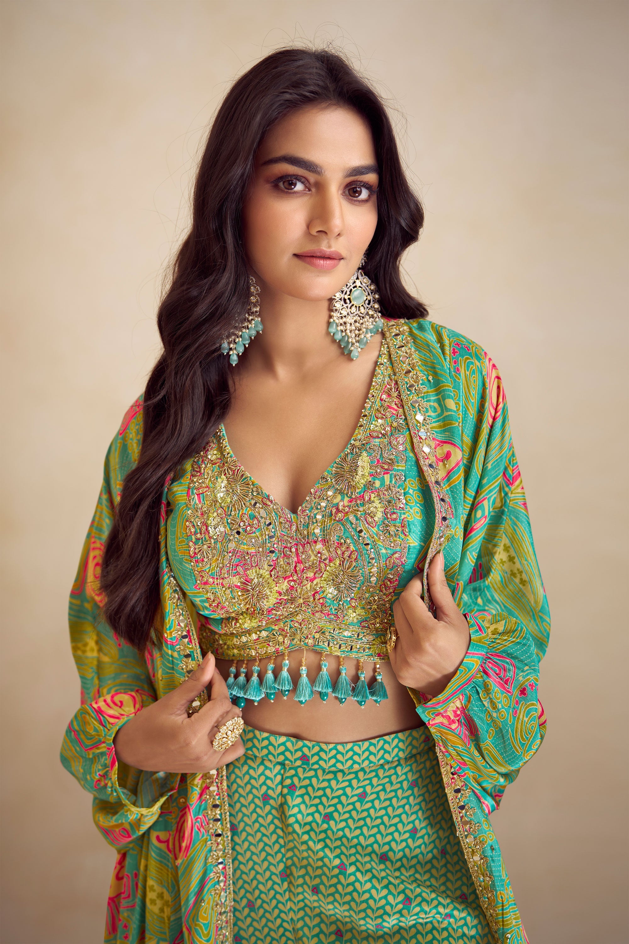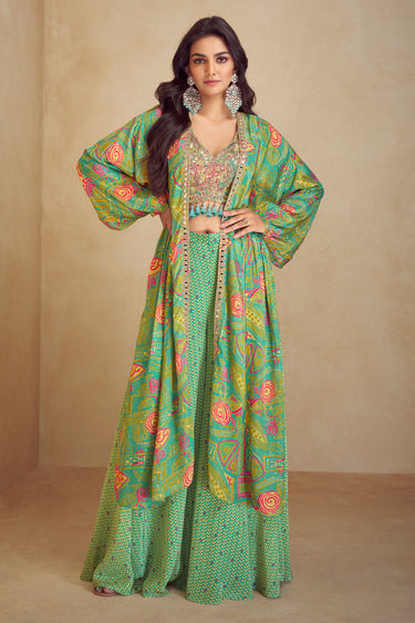 Sea Green Indo Western Cape Palazzo With Digital Printed Work