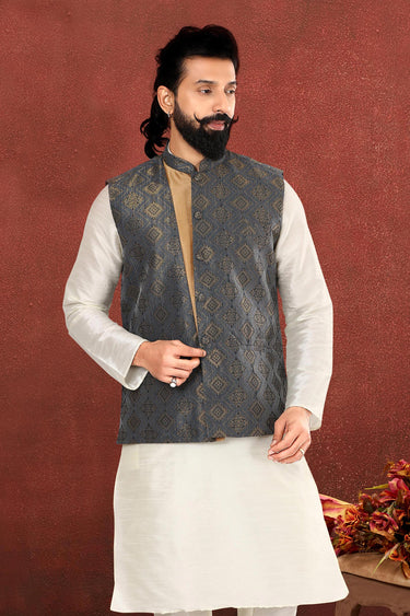 Grey Color Jacquard Silk Fabric Festive Wear Readymade Jacket For Men