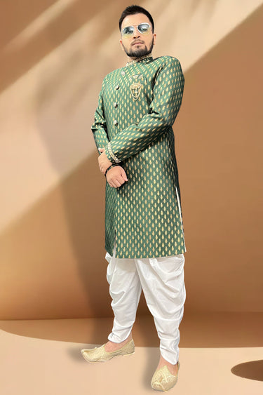 Jacquard Fabric Green Color Wedding Wear Readymade Men Stylish Peshawari Style Indo Western