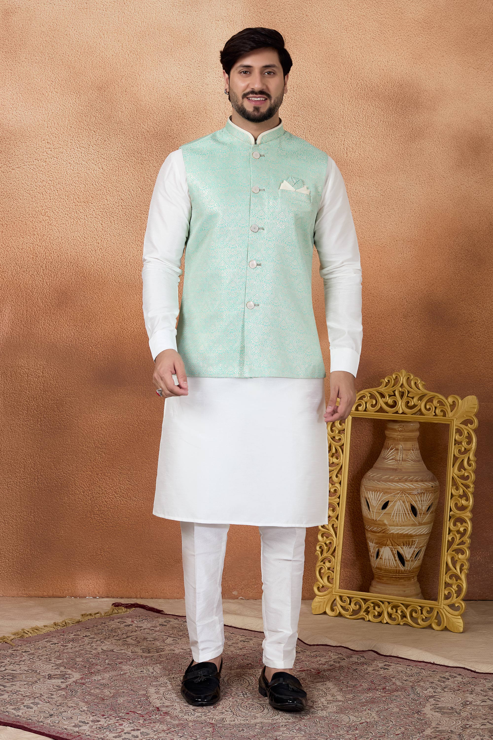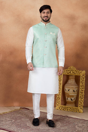 Elevate your traditional look with this Mens Kurta and Aligadhi Pant with Jacket Set, crafted for weddings and special occasions. The jacquard kurta offers a rich textured appeal, paired with an art Banarasi silk Aligadhi pant for a graceful finish. Completed with a faux satinlined jacket for enhanced comfort, slight color variations may occur due to digital photography.