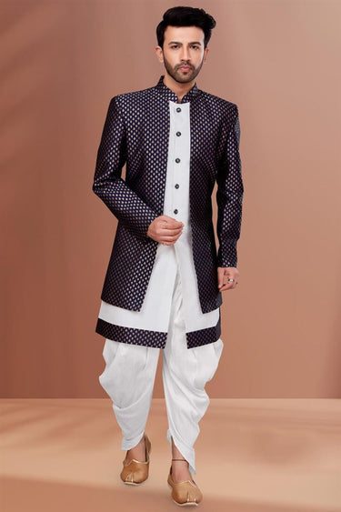 Navy Blue Gorgeous Jacquard Fabric Wedding Wear Readymade Dhoti Style Indo Western For Men