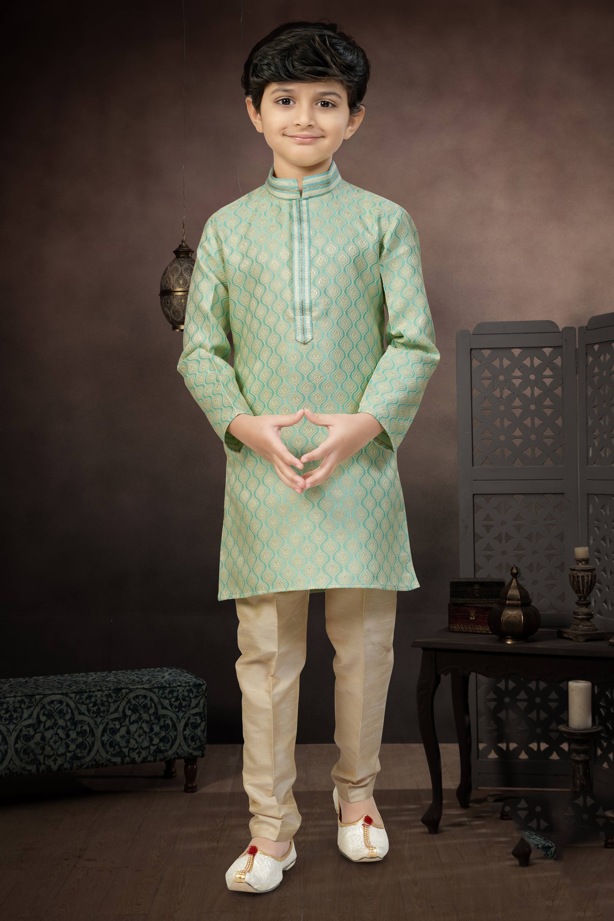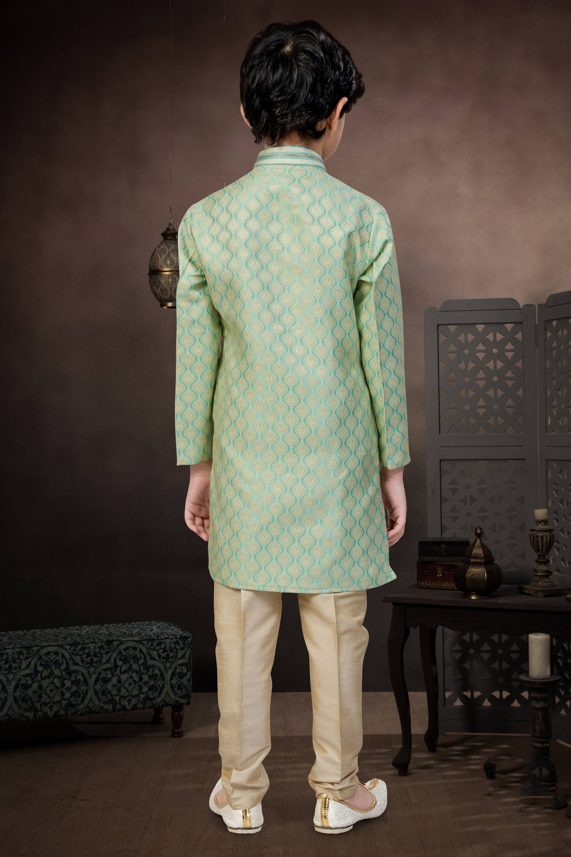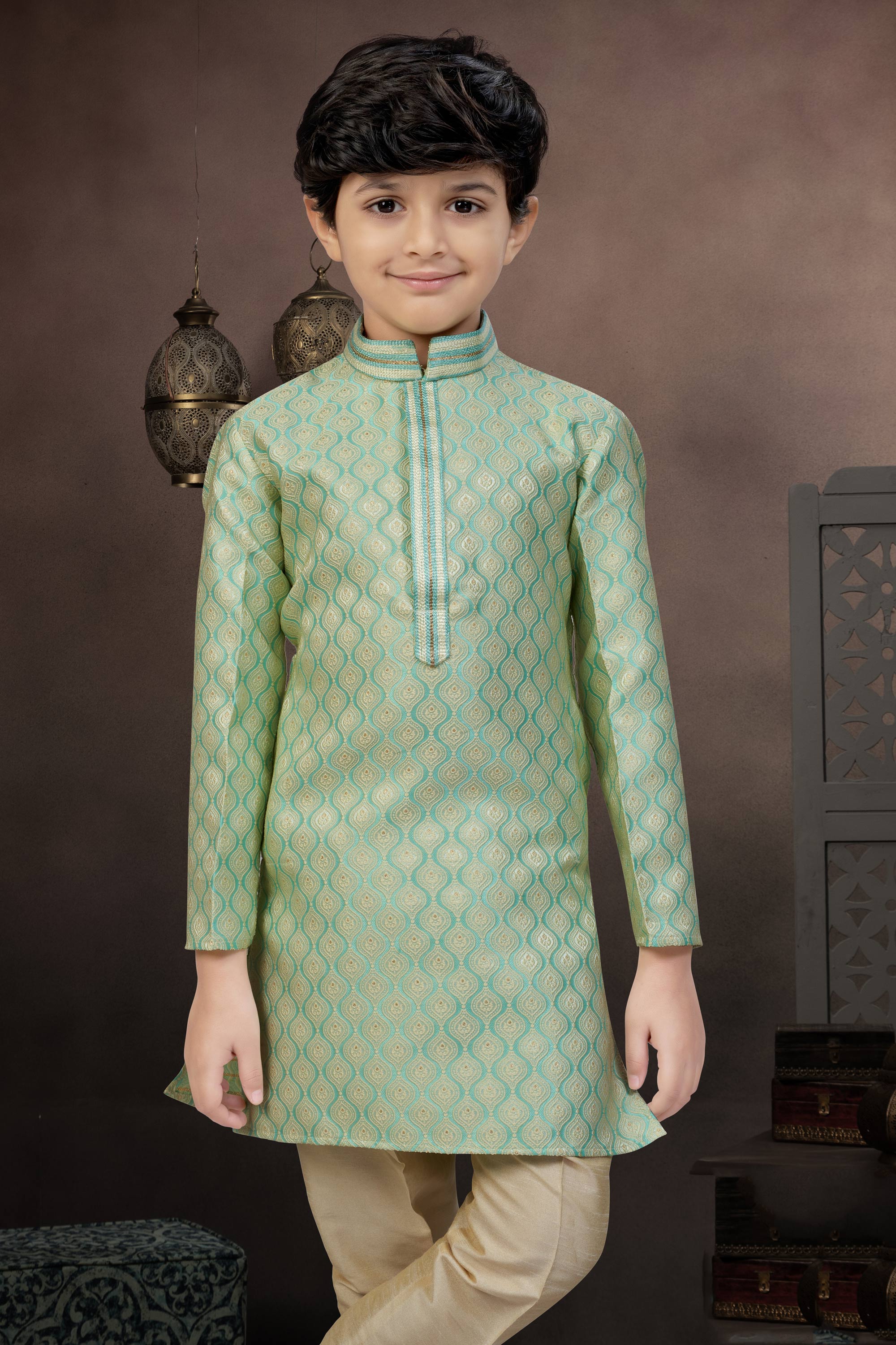 Green Sangeet Wear Jacquard Fabric Readymade Kurta Pyjama For Boys