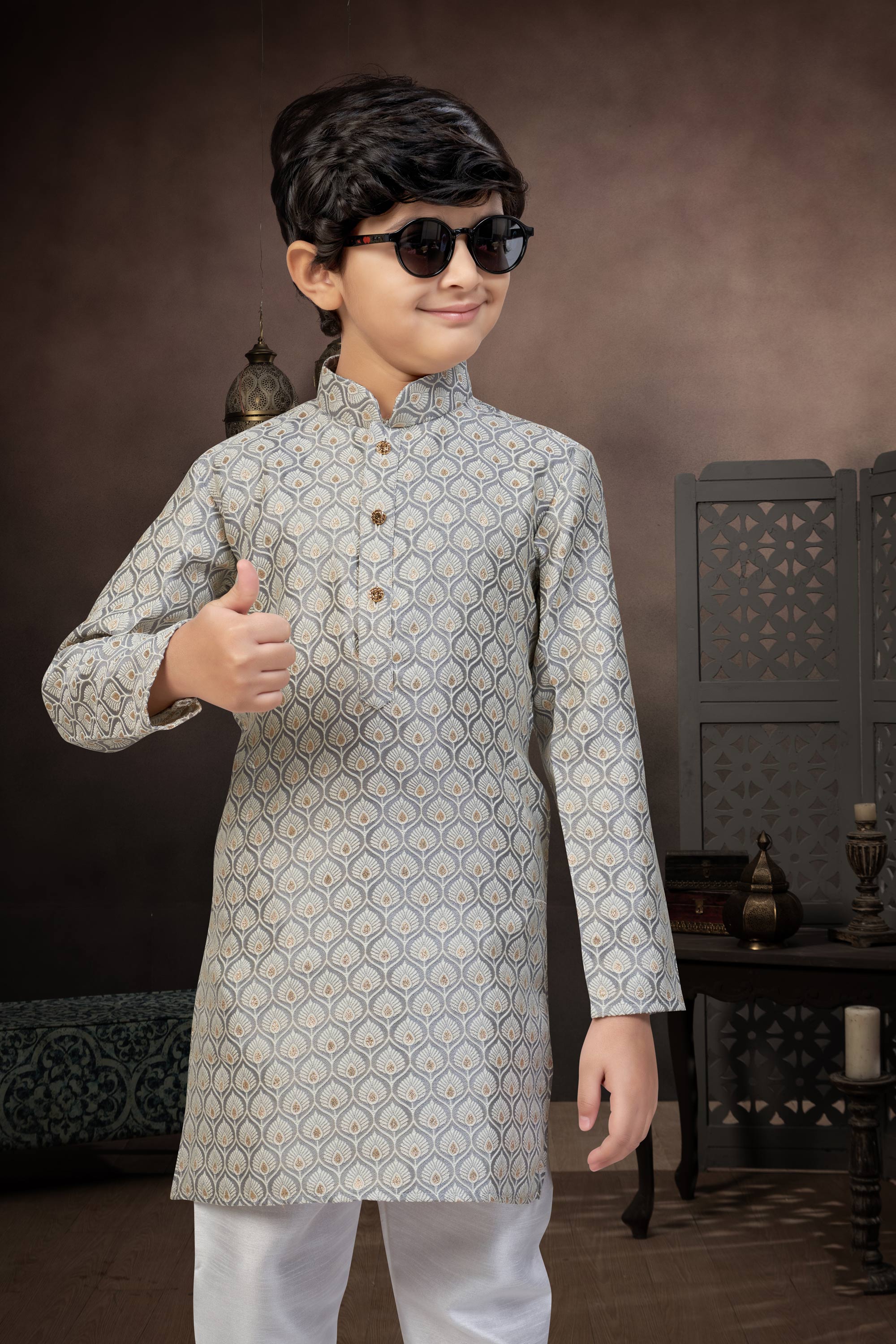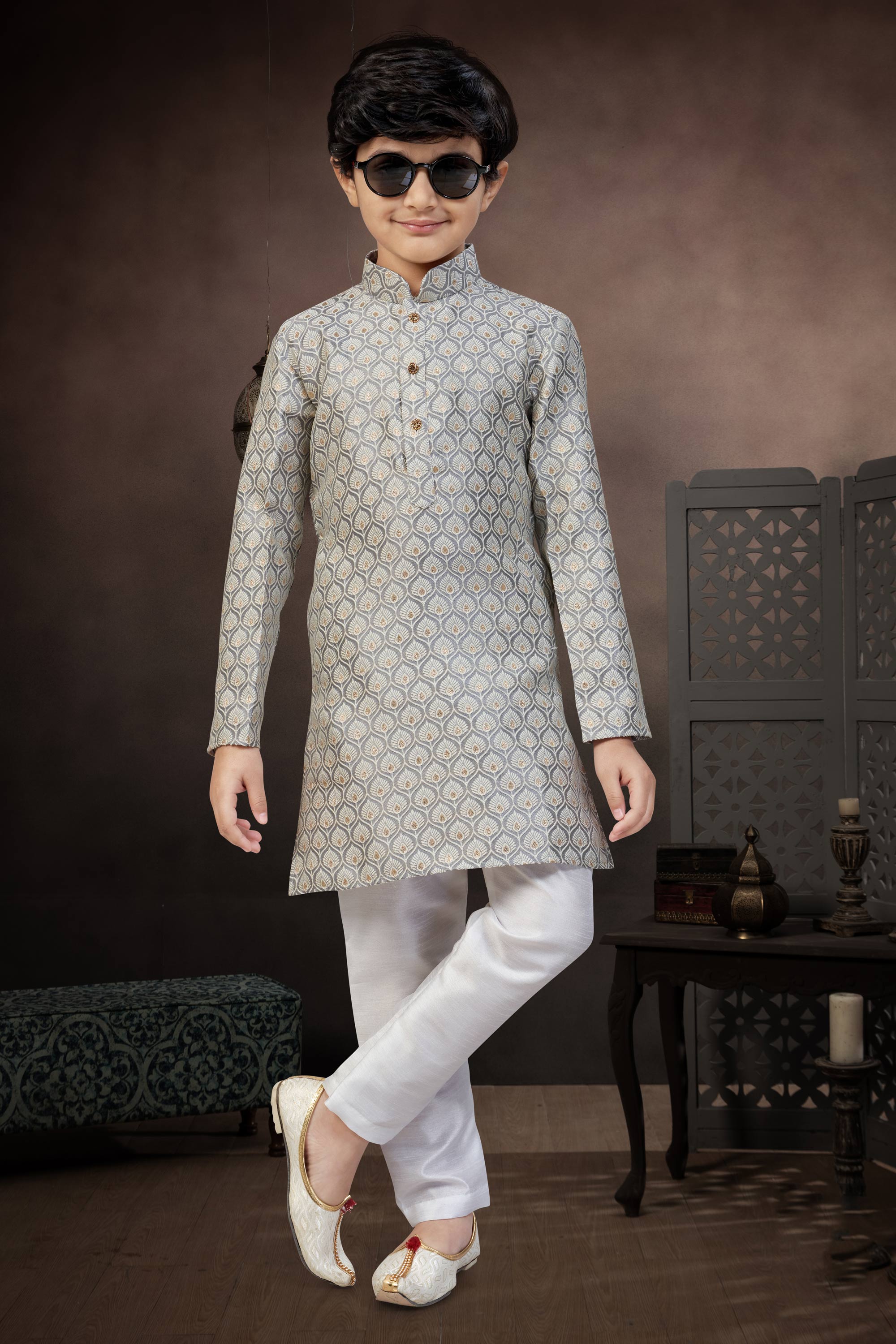 Grey Sangeet Wear Jacquard Fabric Boys Readymade Kurta Pyjama For Sangeet Wear