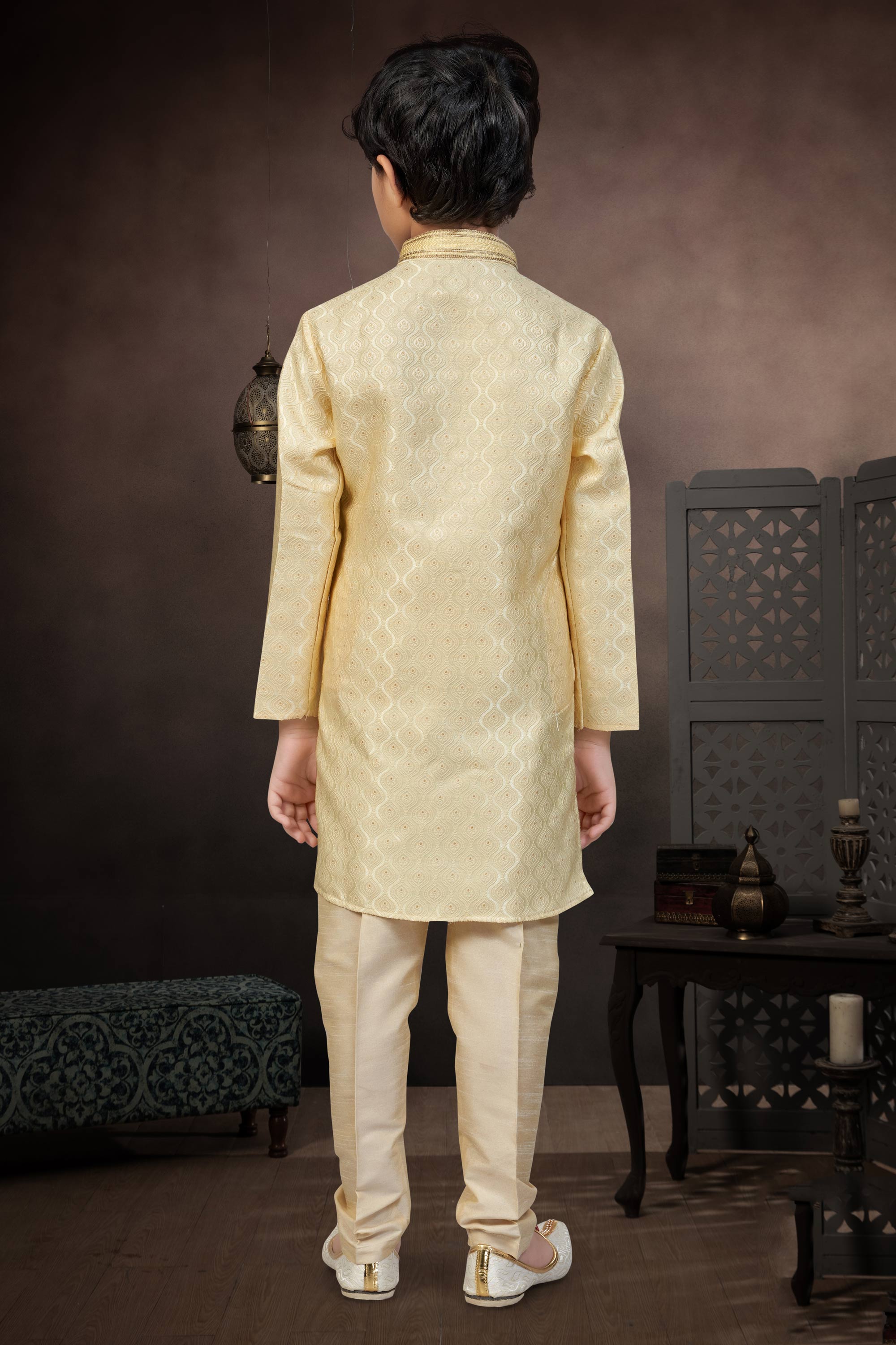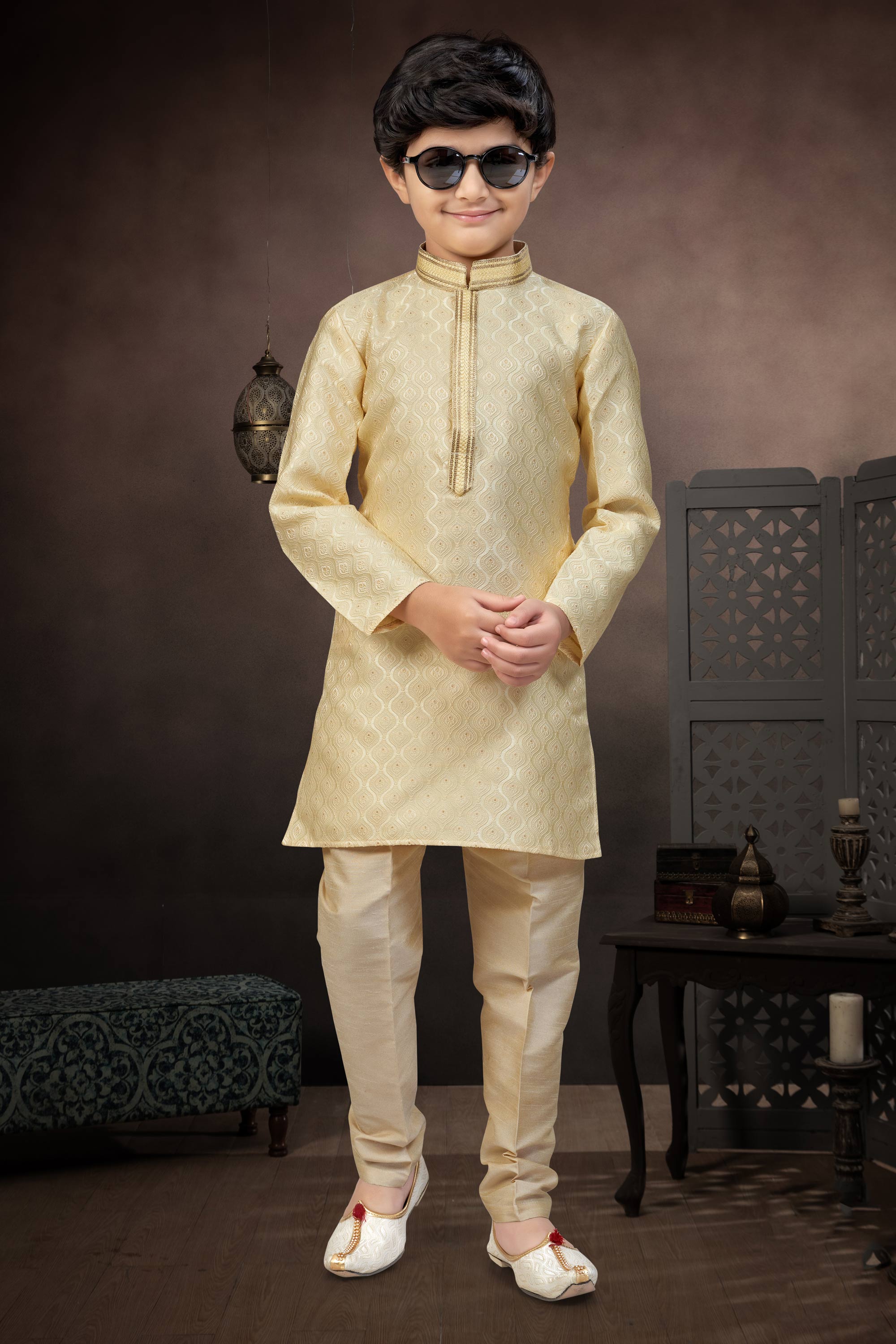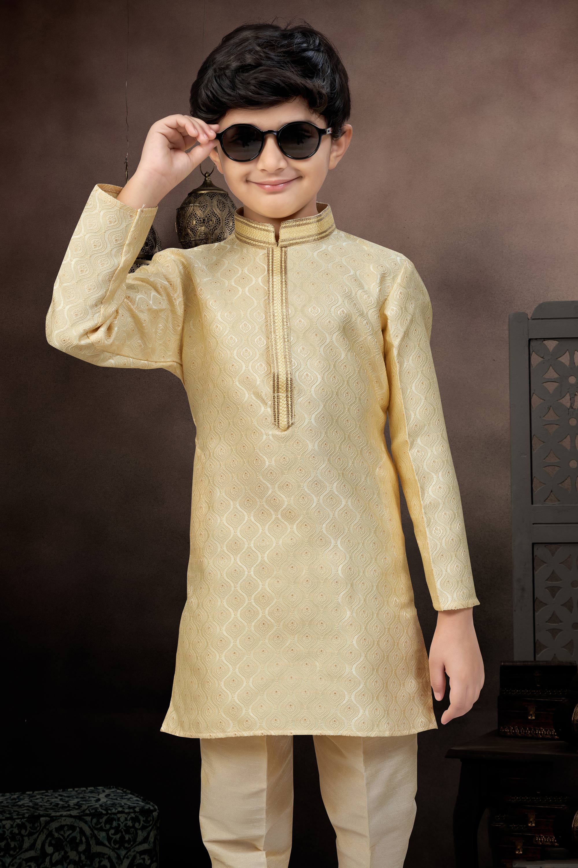 Jacquard Fabric Beige Boys Readymade Kurta Pyjama For Sangeet Wear