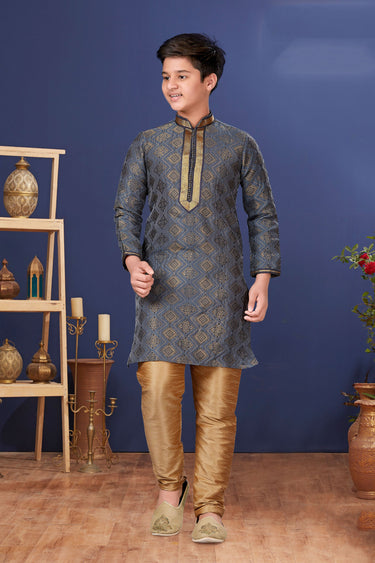 Traditional Wear Jacquard Silk Fabric Grey Color Fancy Readymade Kurta Pyjama For Boys