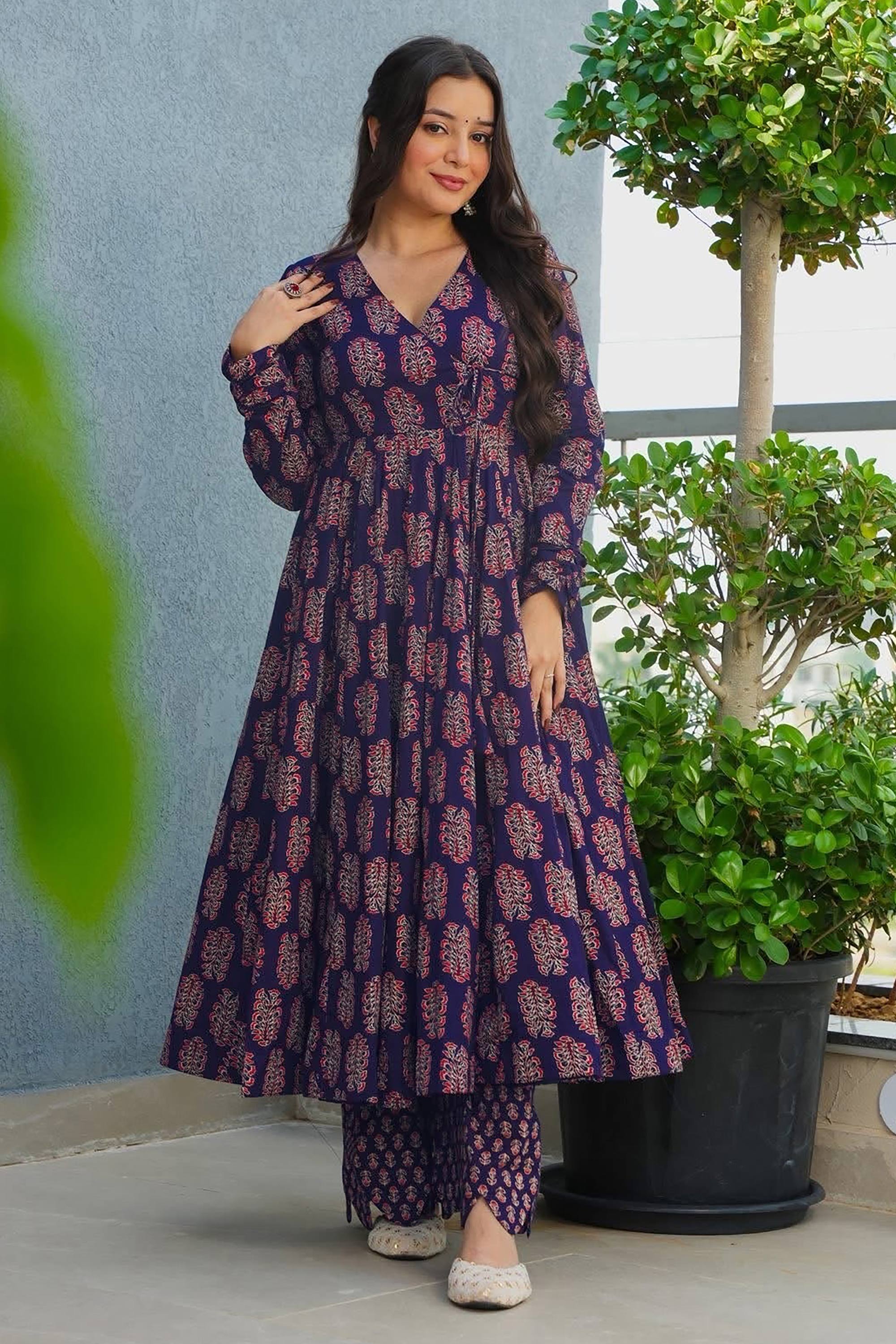 Printed Purple Knee Length Fit And Flare A Line Readymade Kurti With Bottom