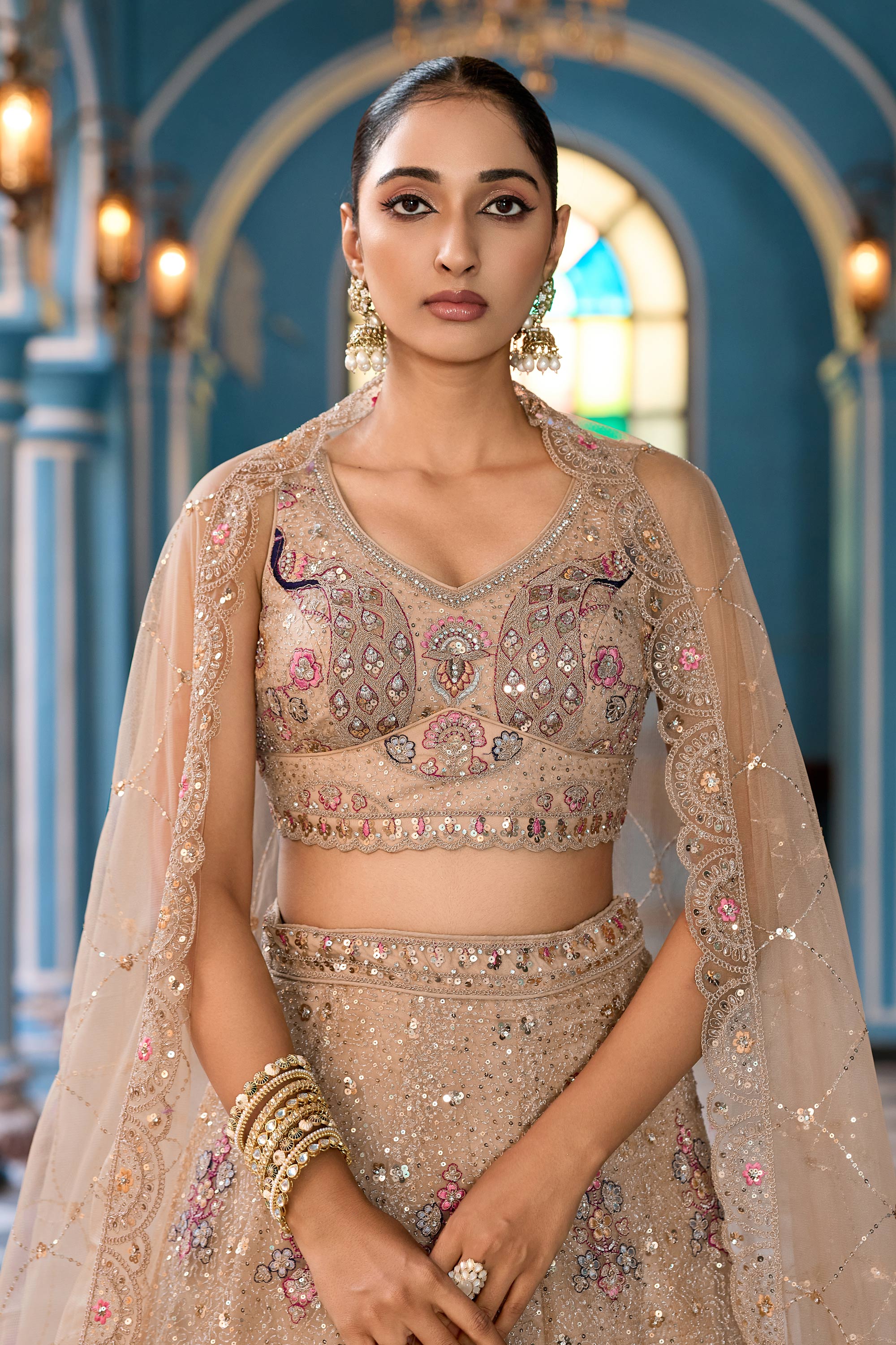 Cream Wedding Wear Net Fabric Embroidered Lehenga Choli