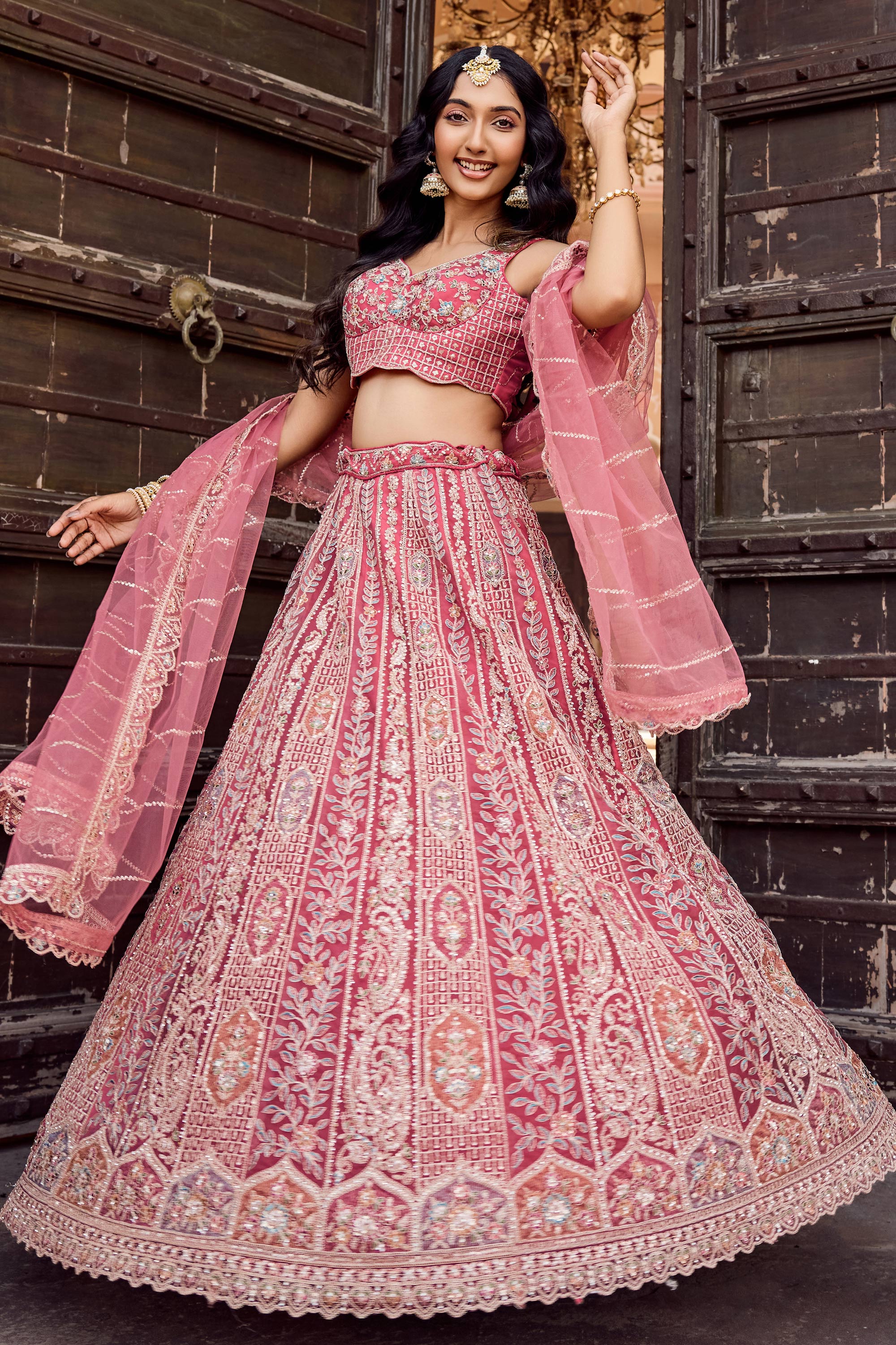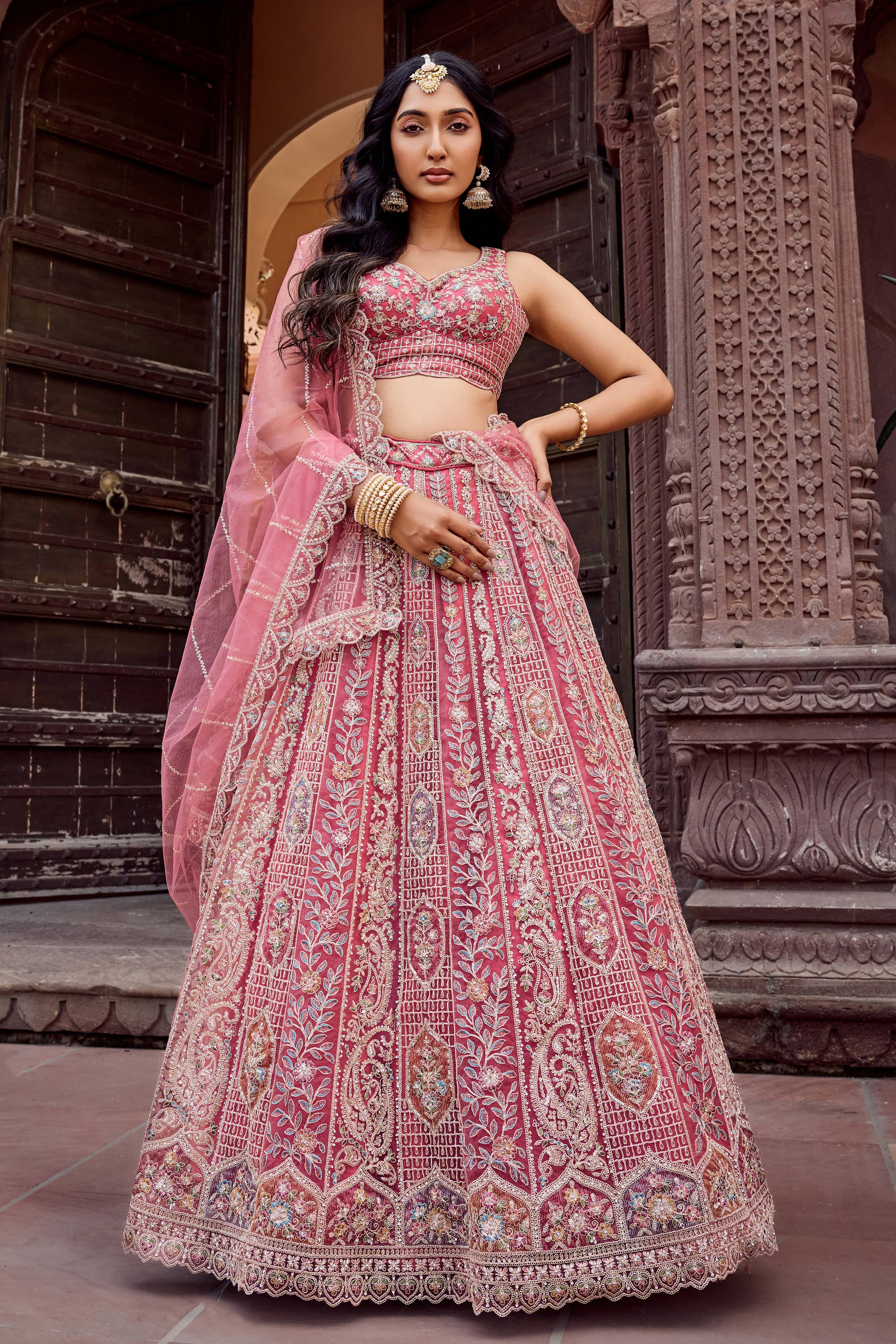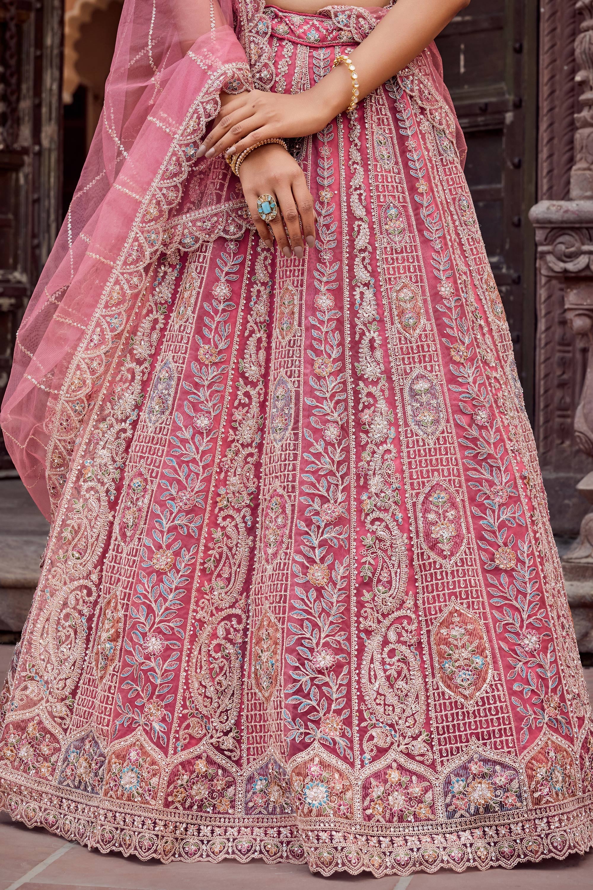 Embroidered Net Fabric Pink Lehenga Choli For Wedding Wear