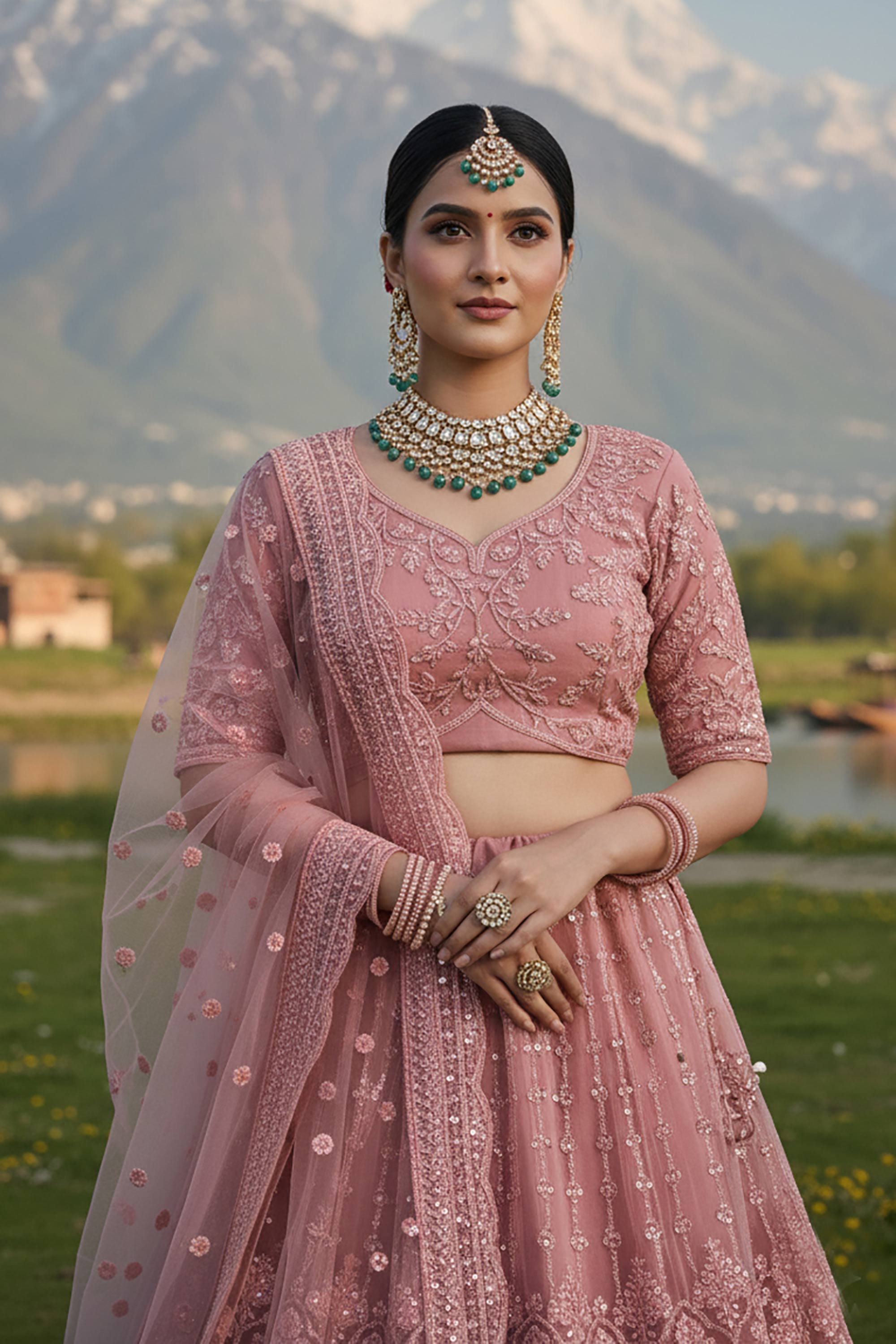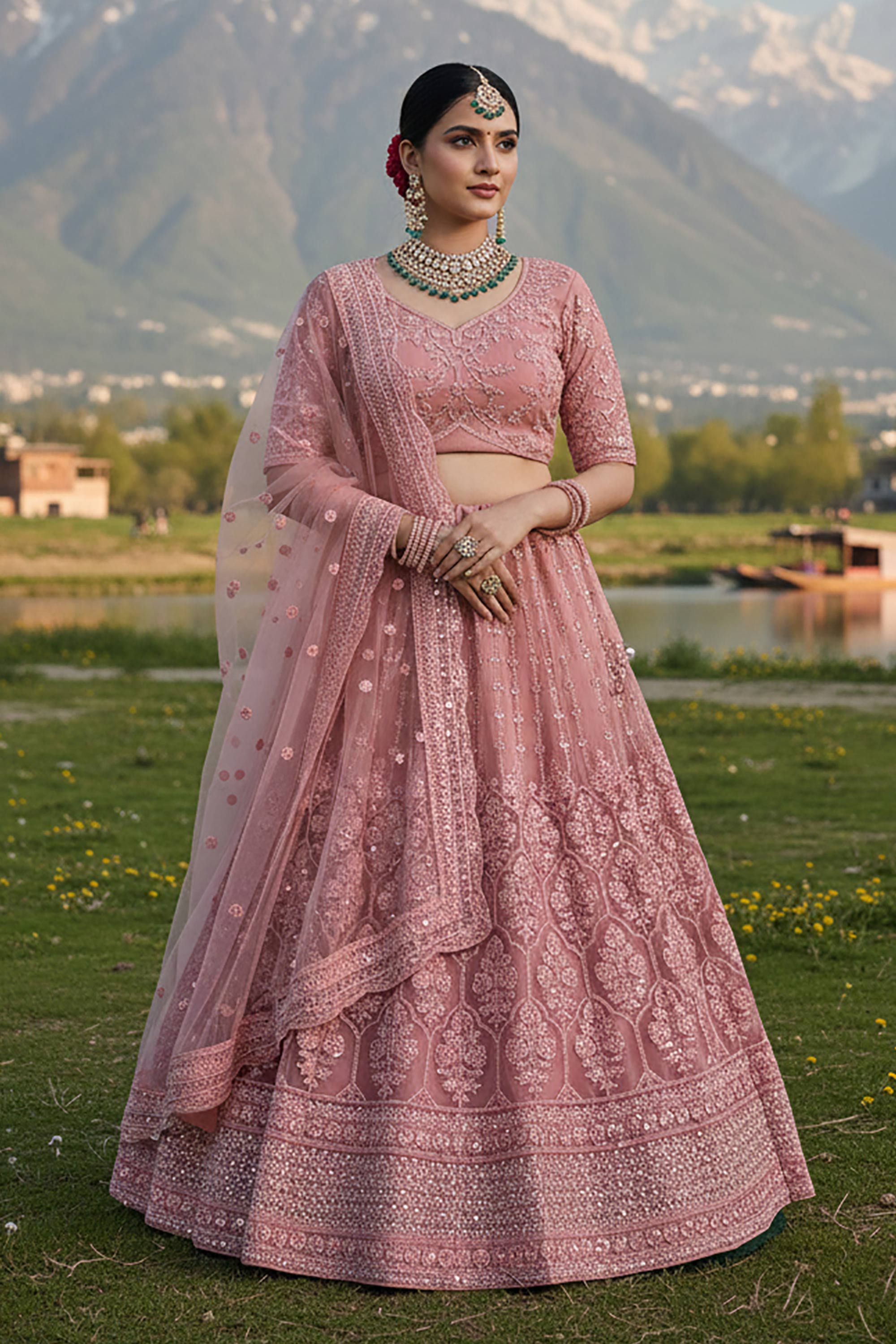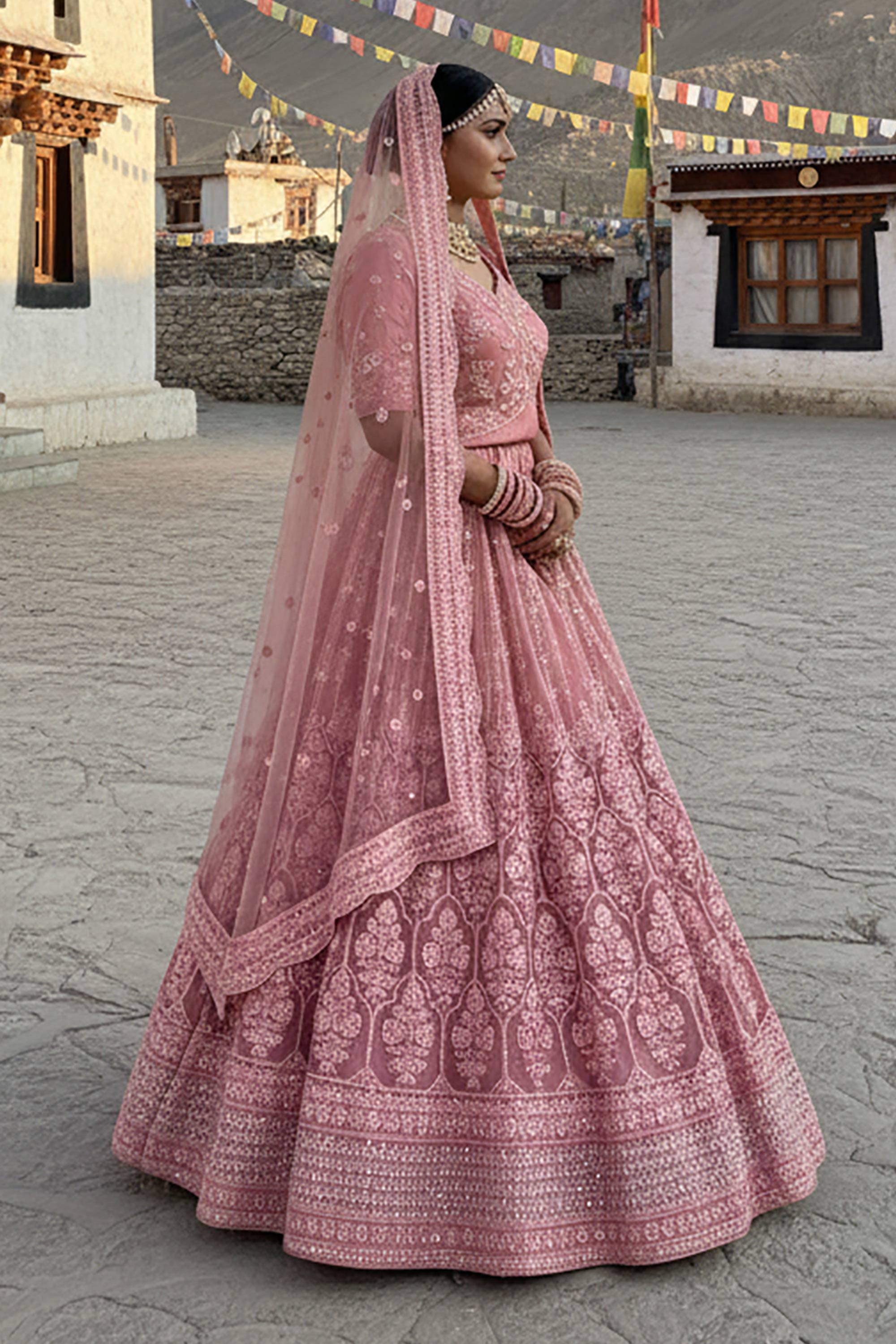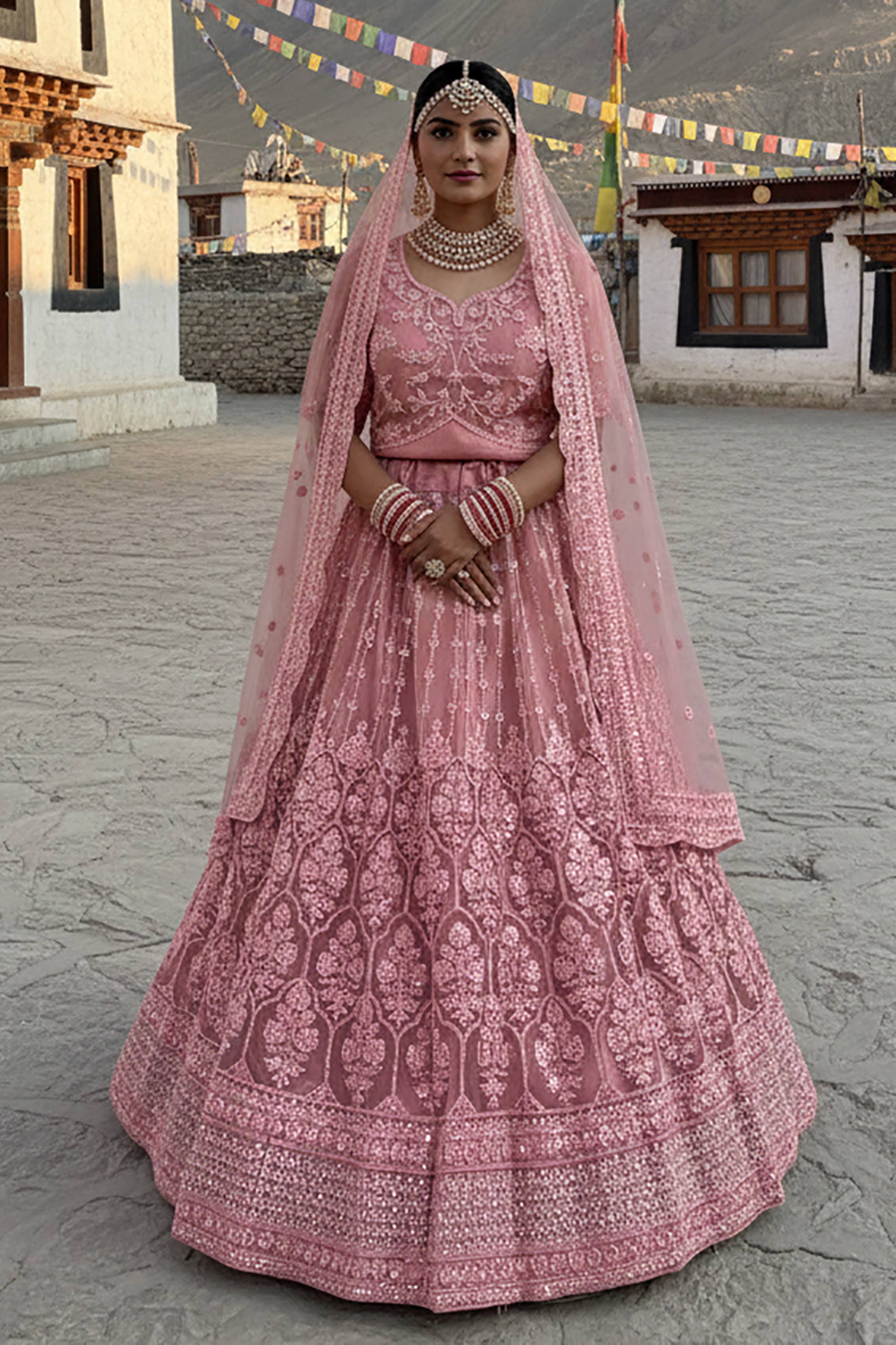 Embroidered Net Pink Wedding Wear Lehenga Choli With Dupatta