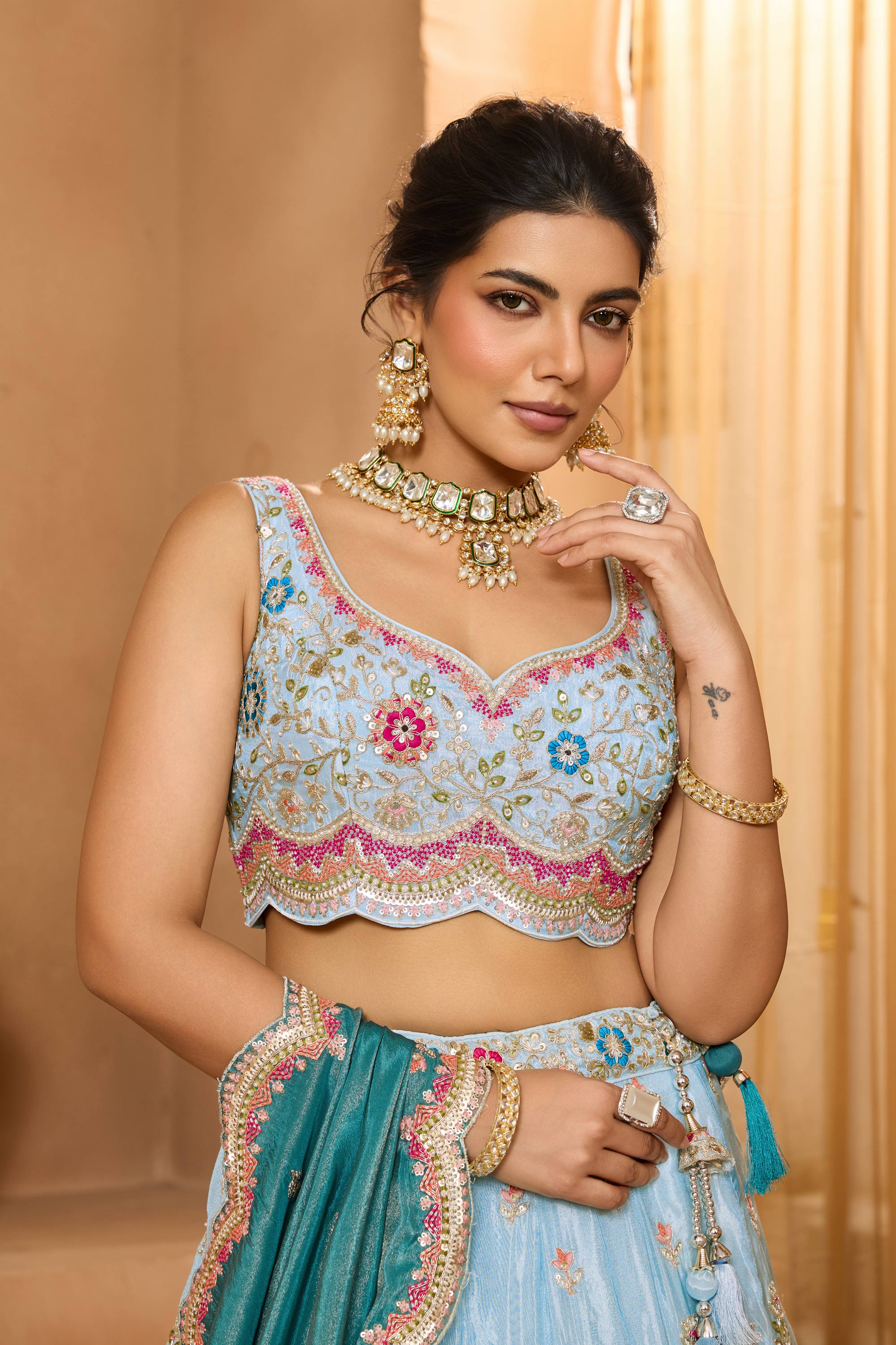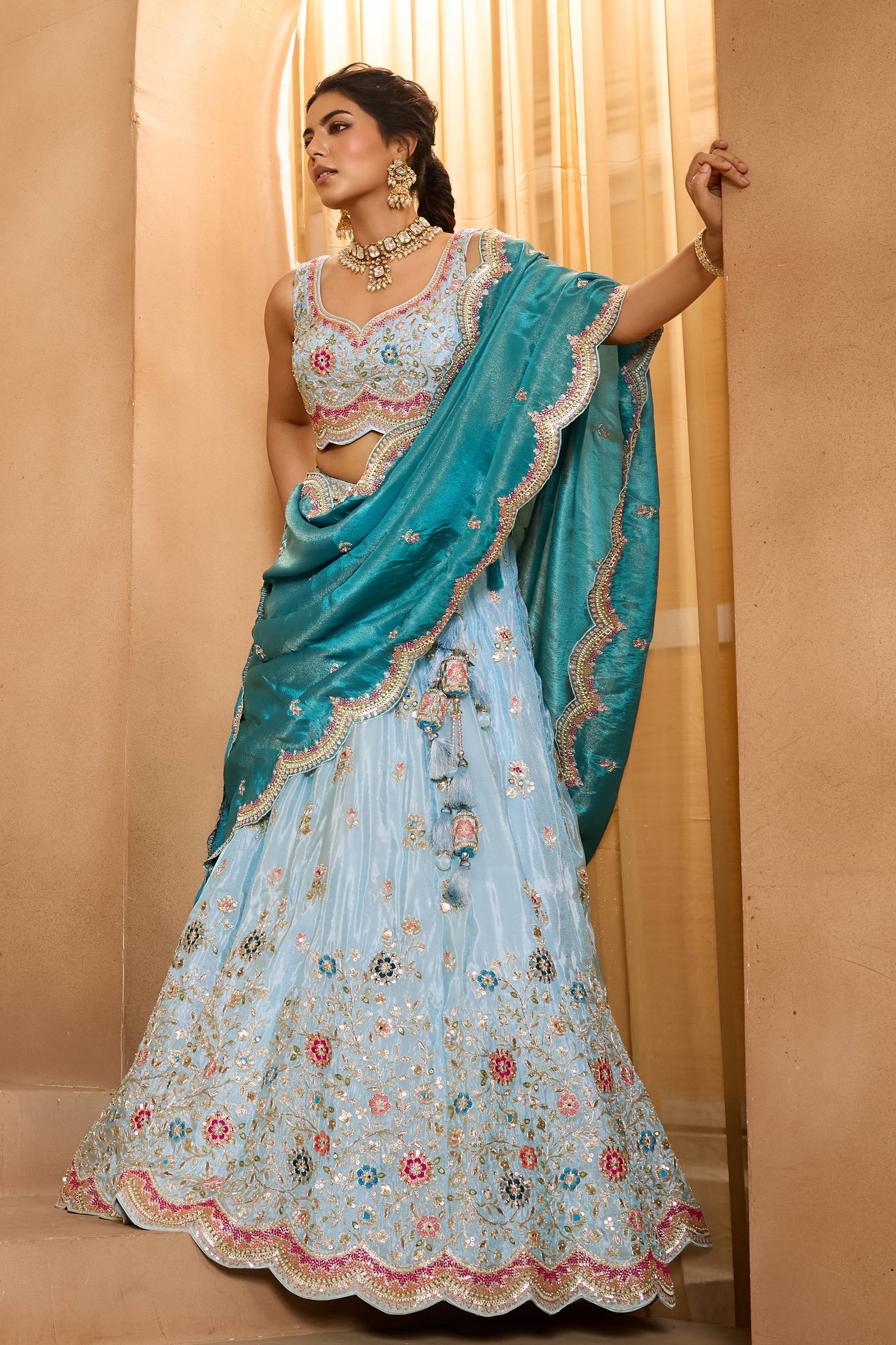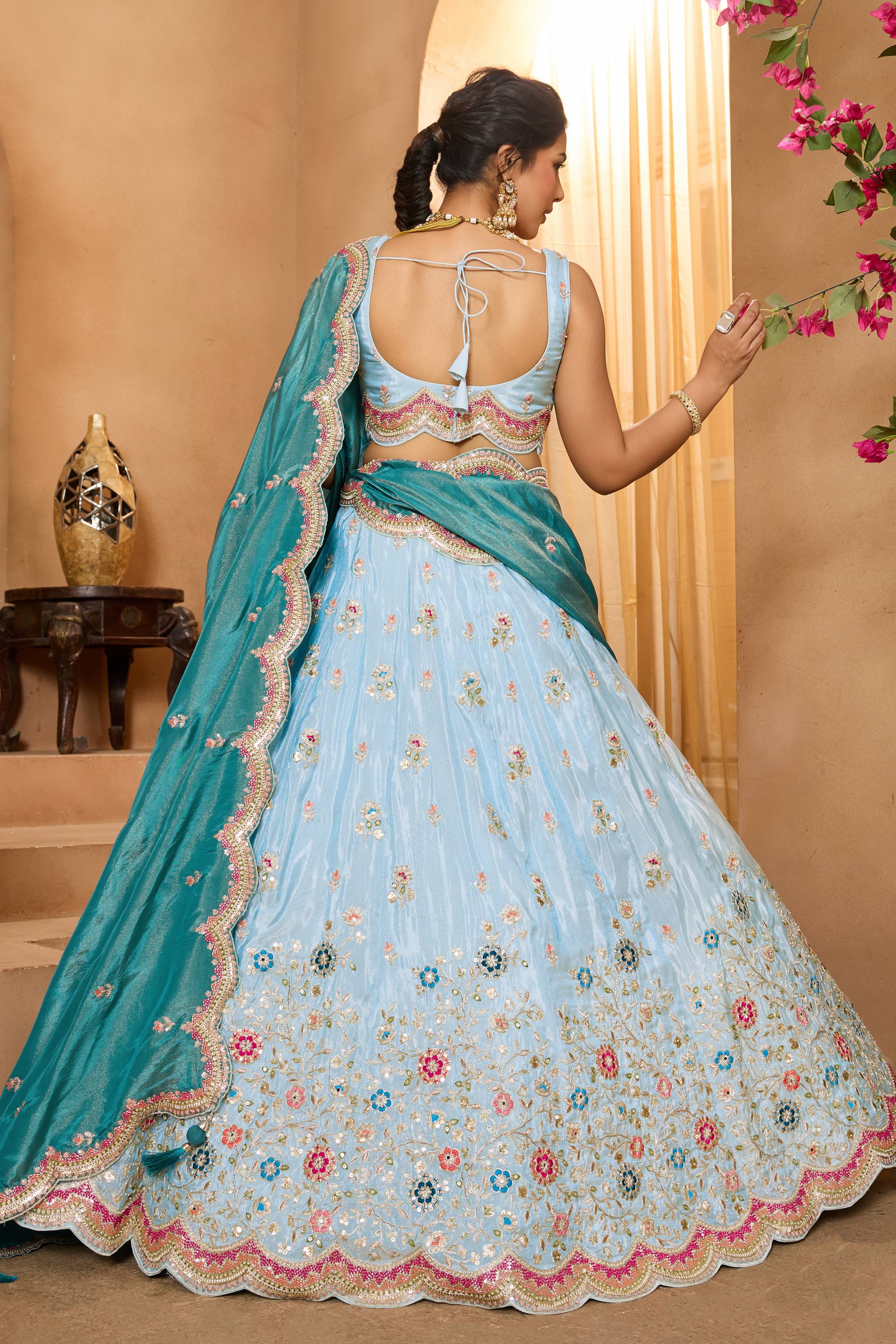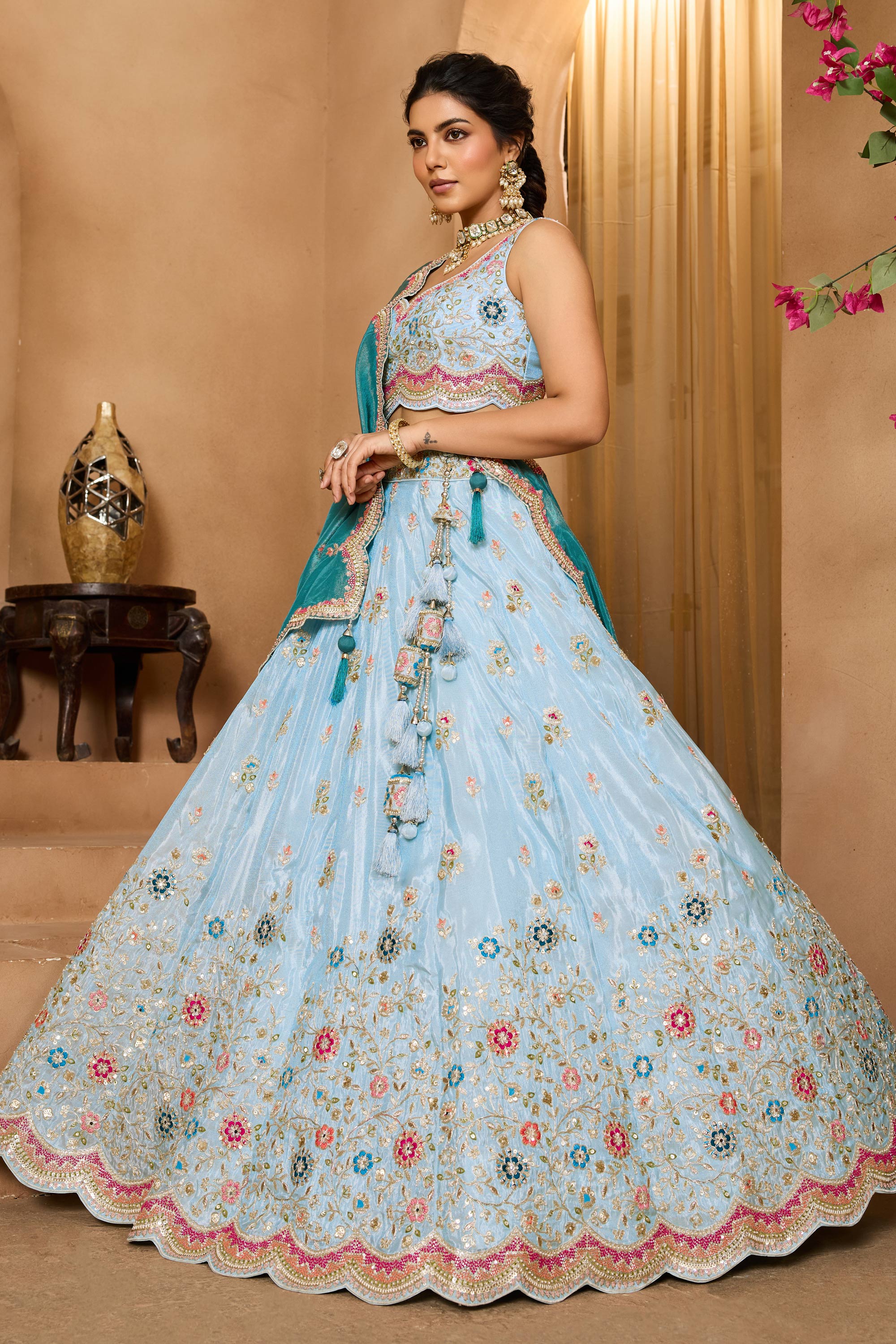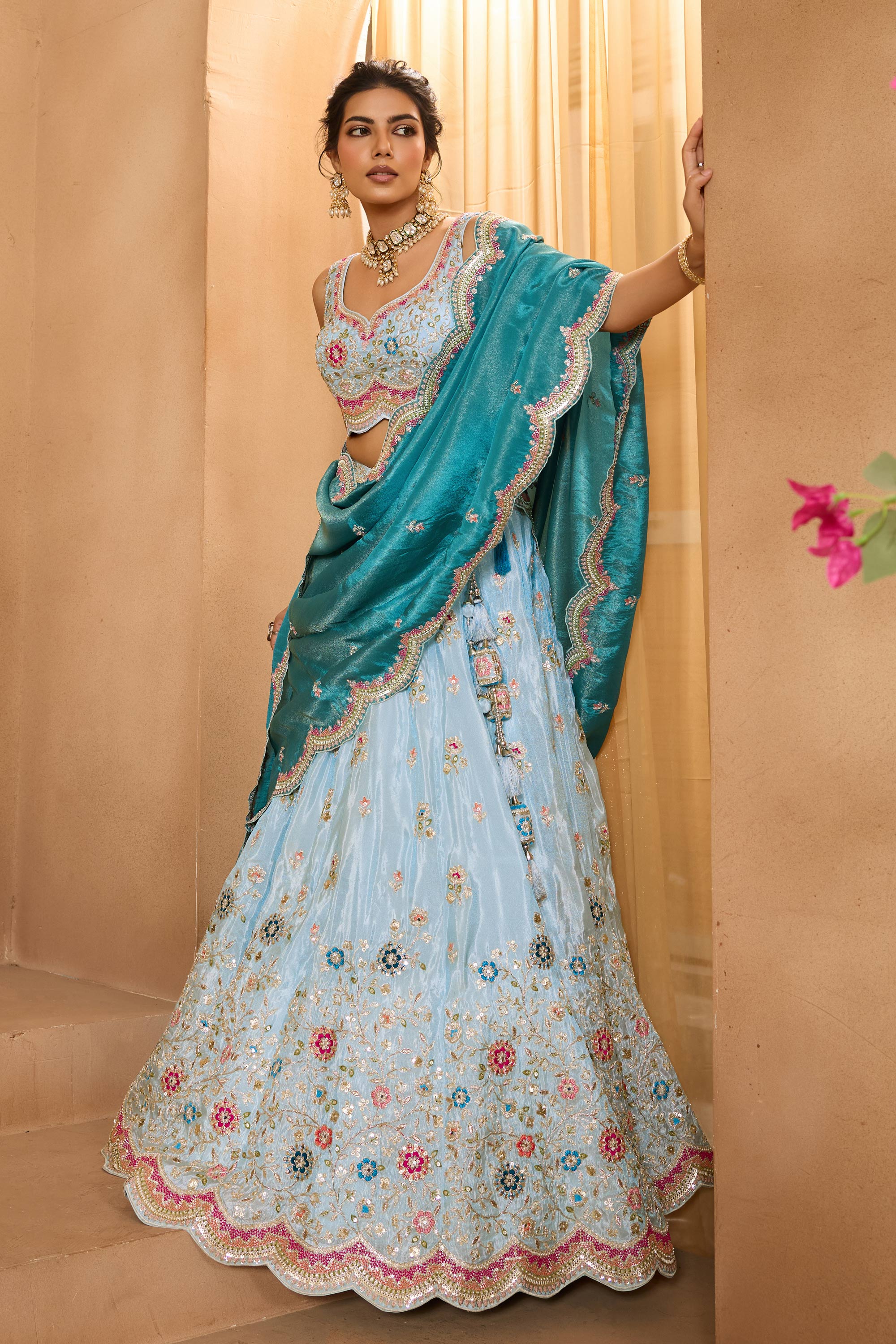 Embroidered Tissue Cyan Wedding Wear Lehenga Choli With Dupatta