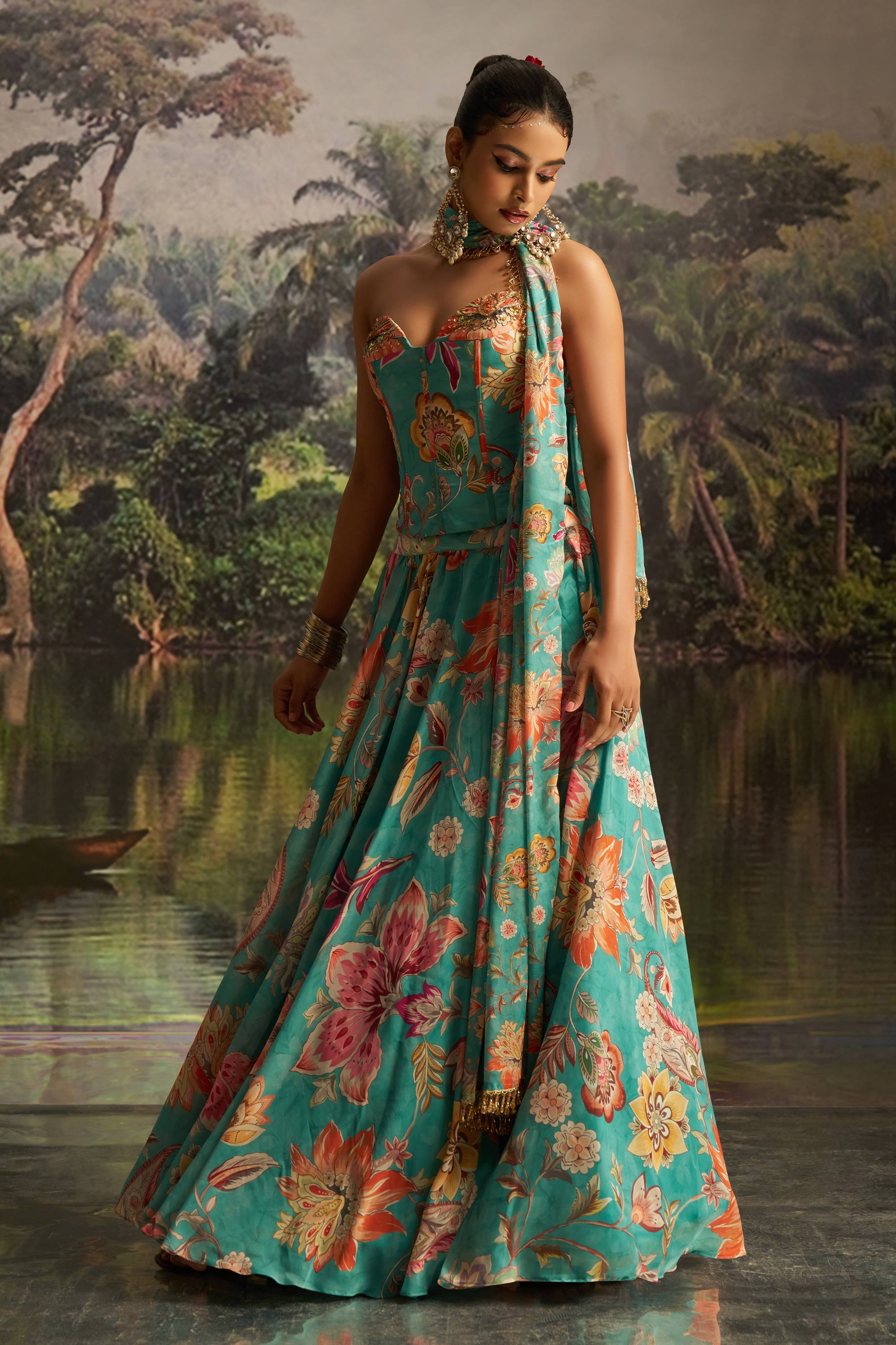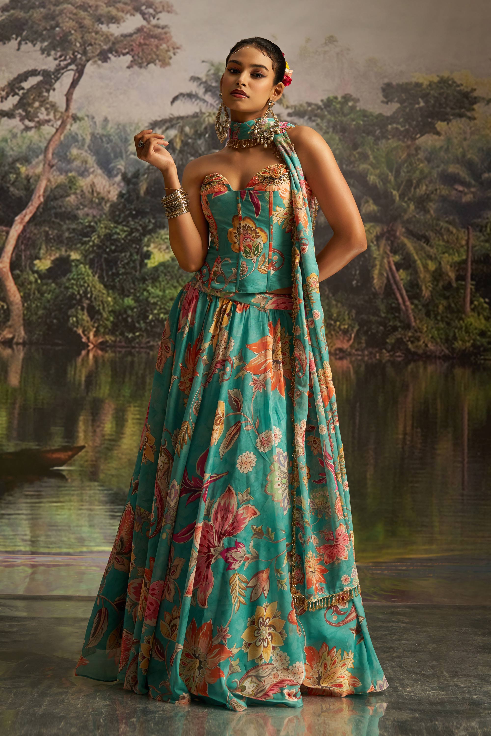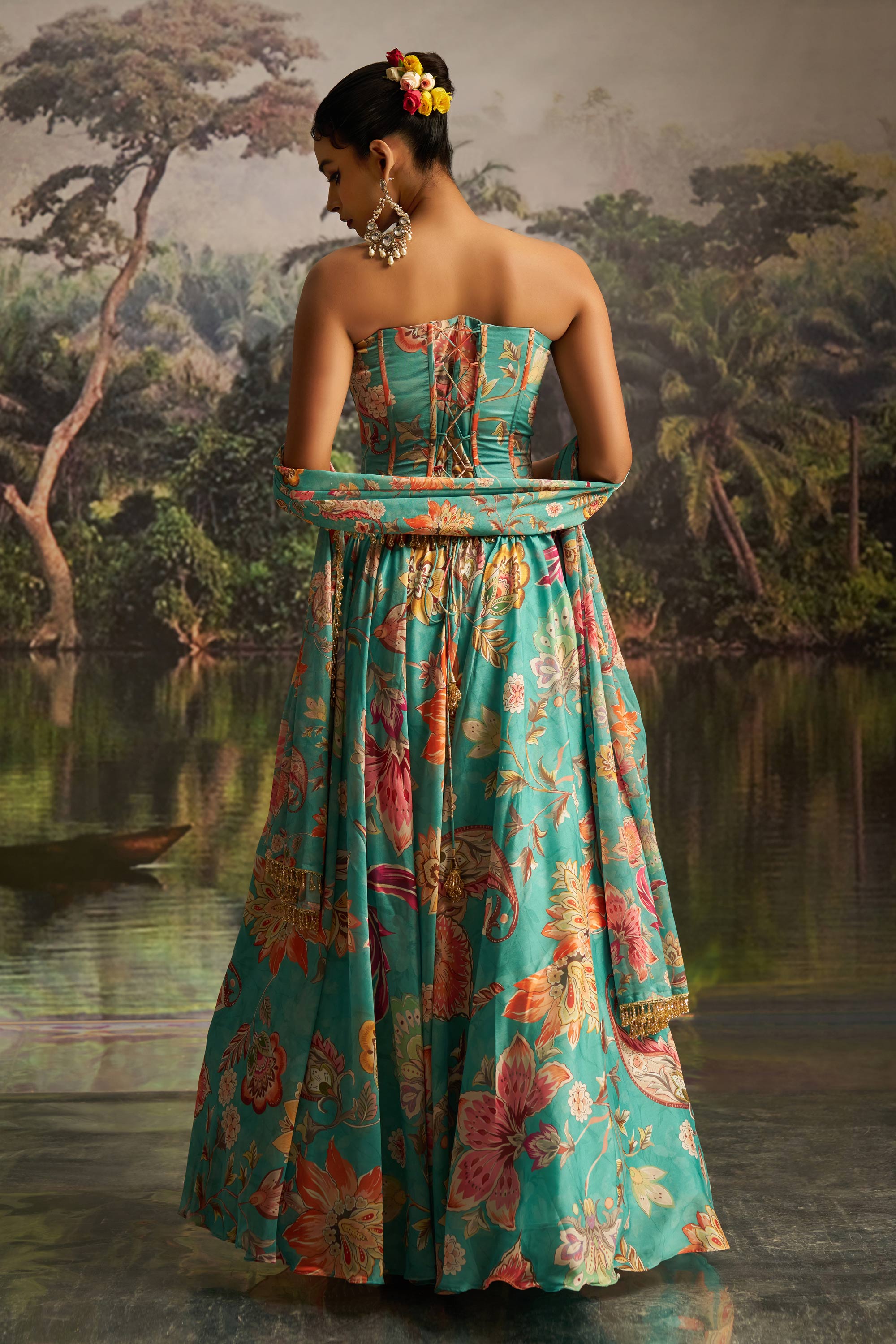 Georgette Cyan Floral Printed Readymade Lehenga Set With Corset Blouse