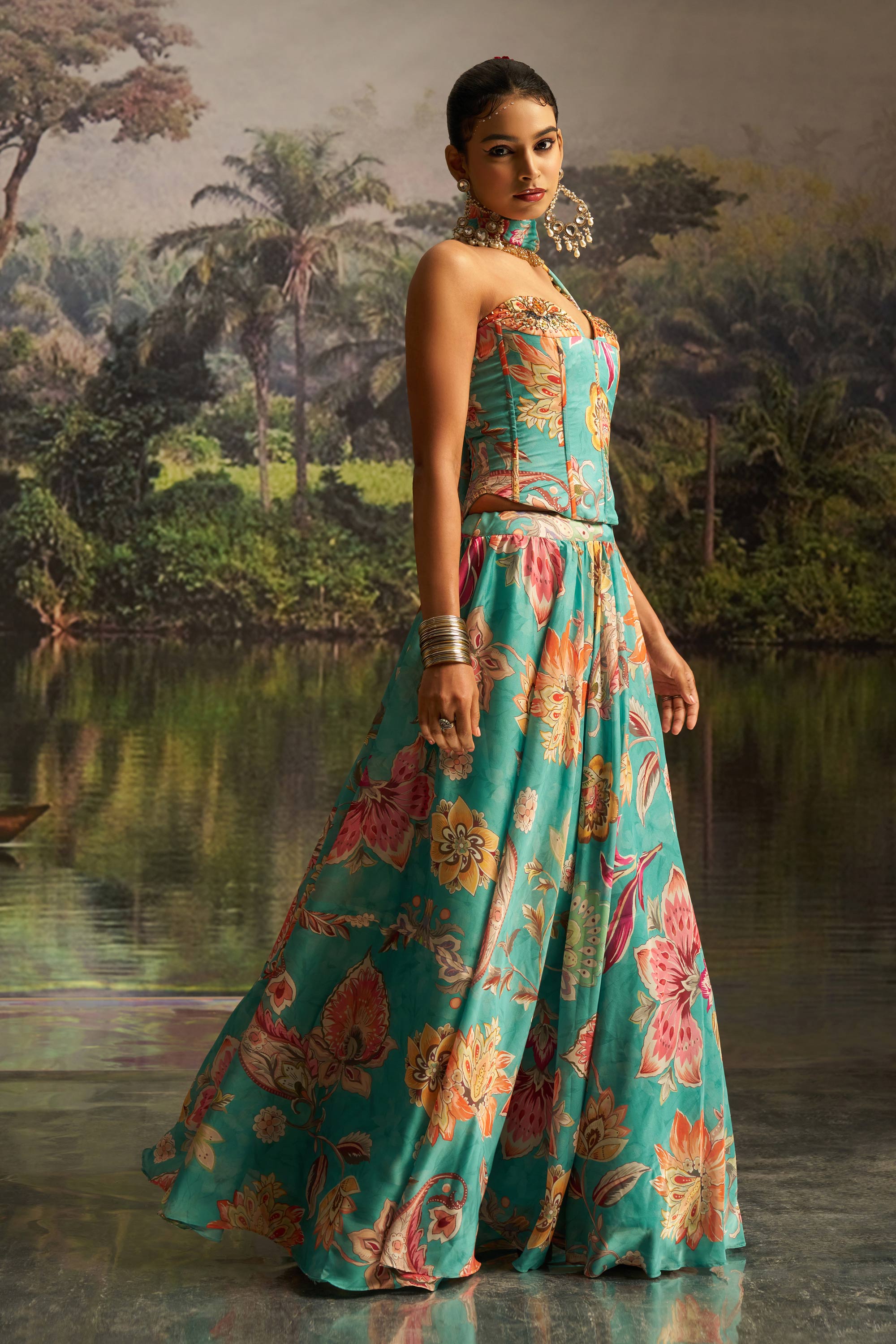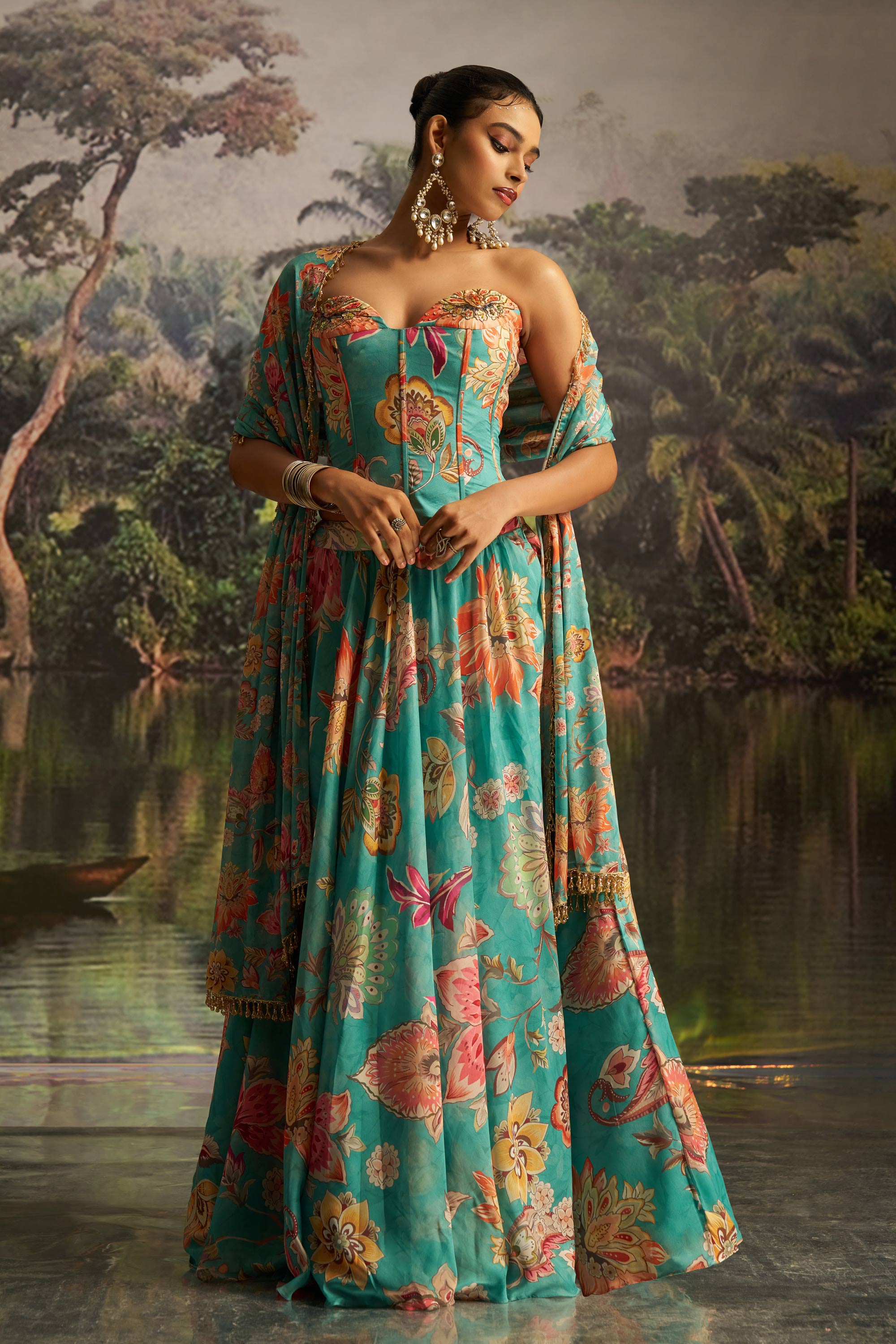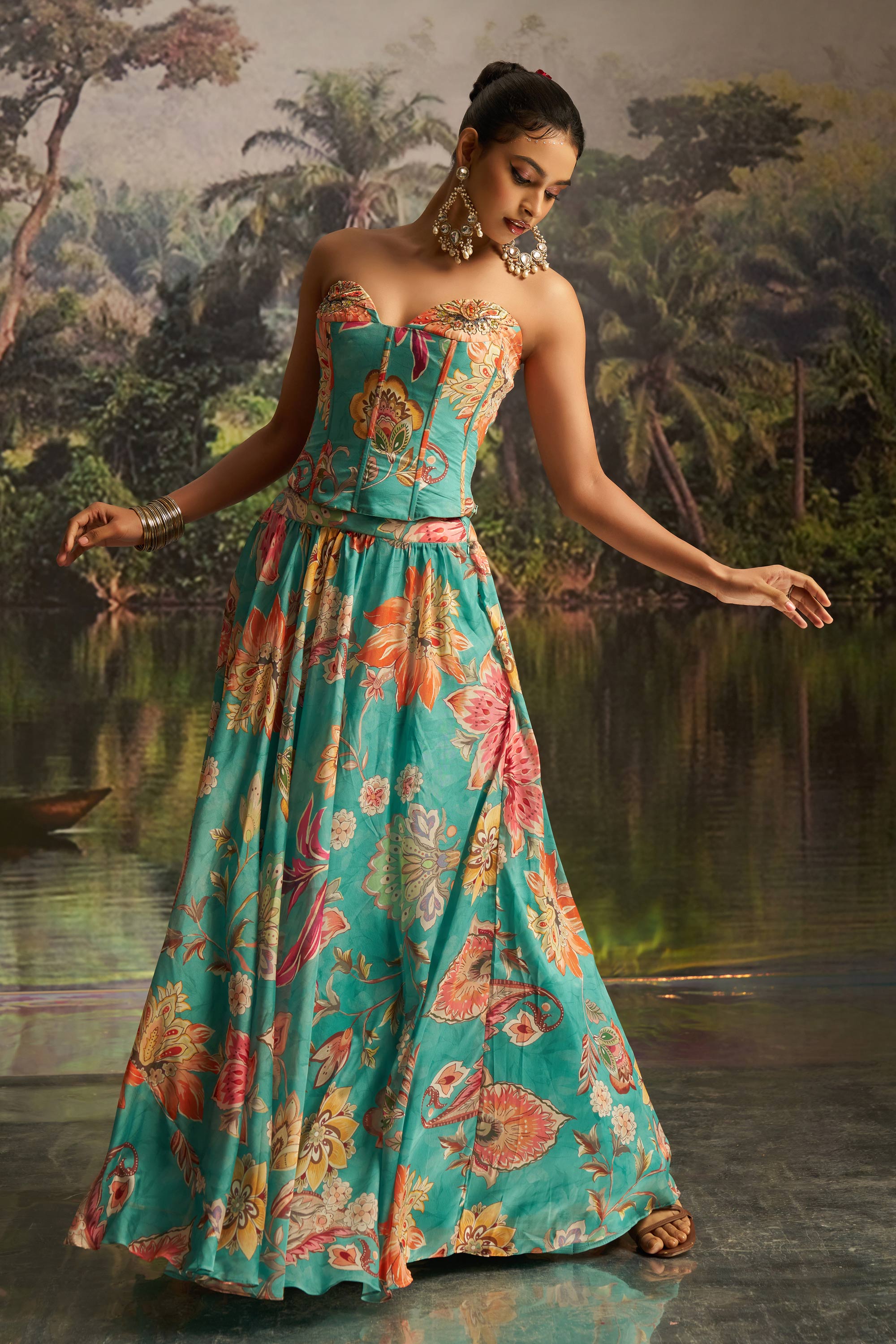 Georgette Cyan Floral Printed Readymade Lehenga Set With Corset Blouse