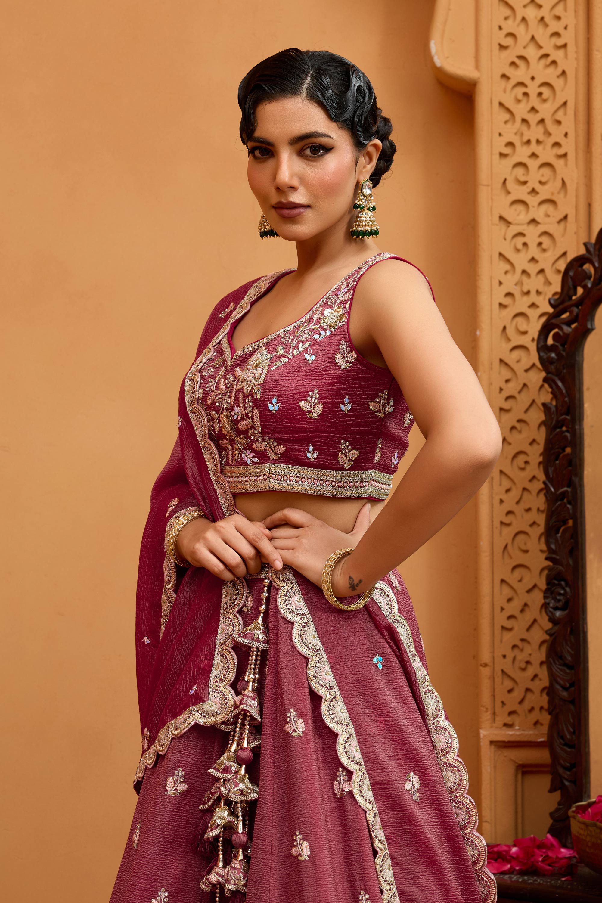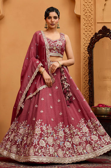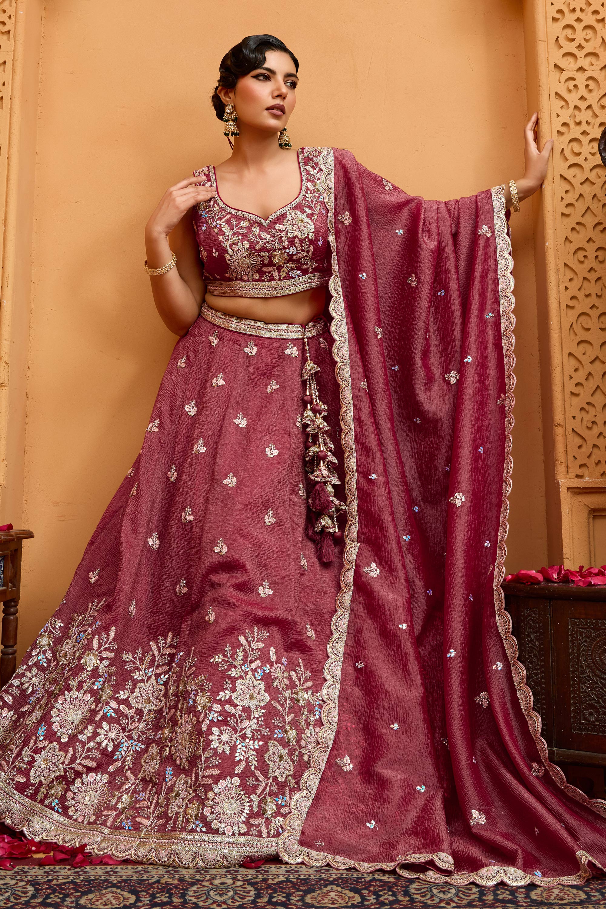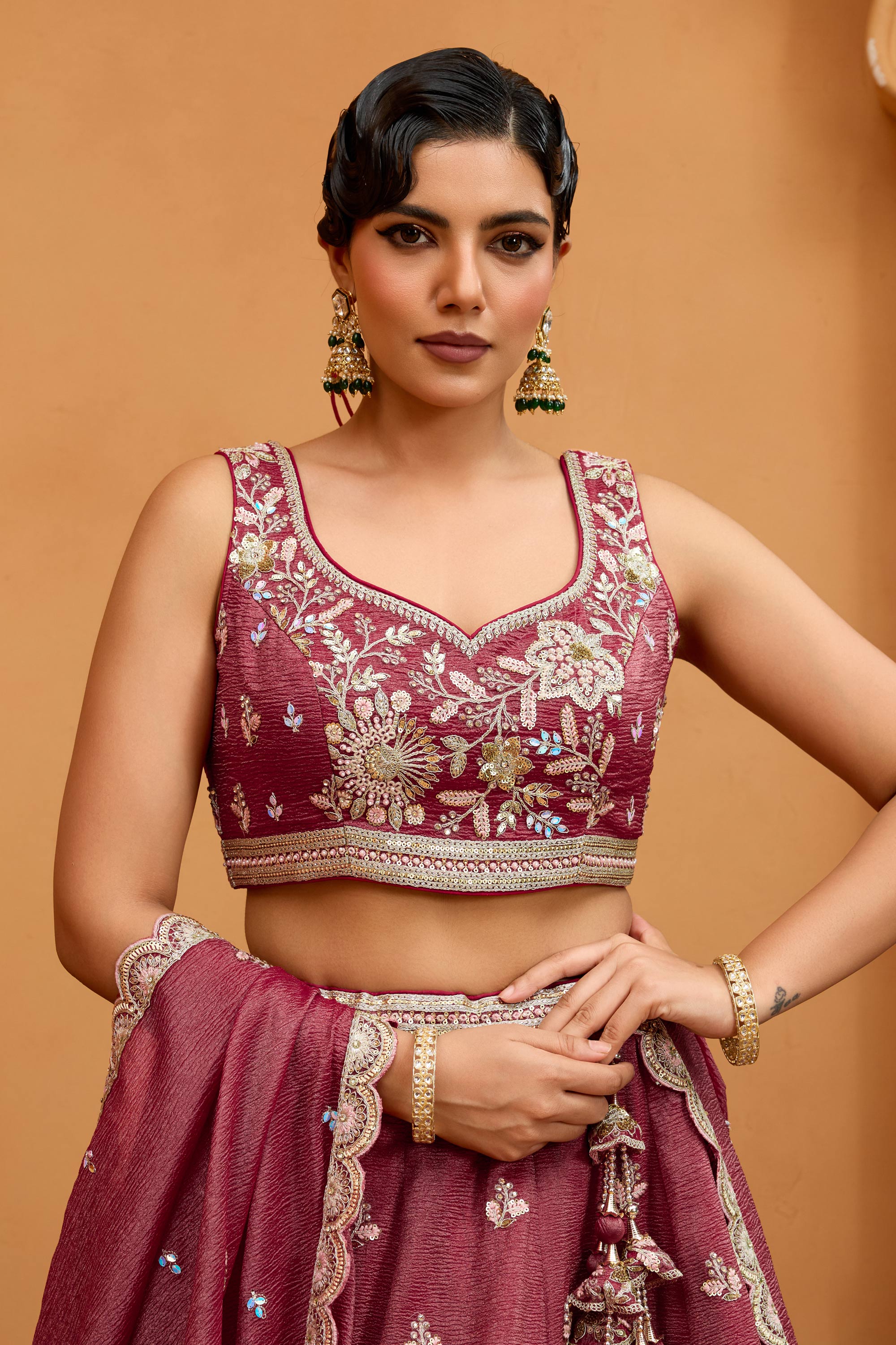 Maroon Wedding Wear Embroidered Tissue Lehenga Choli