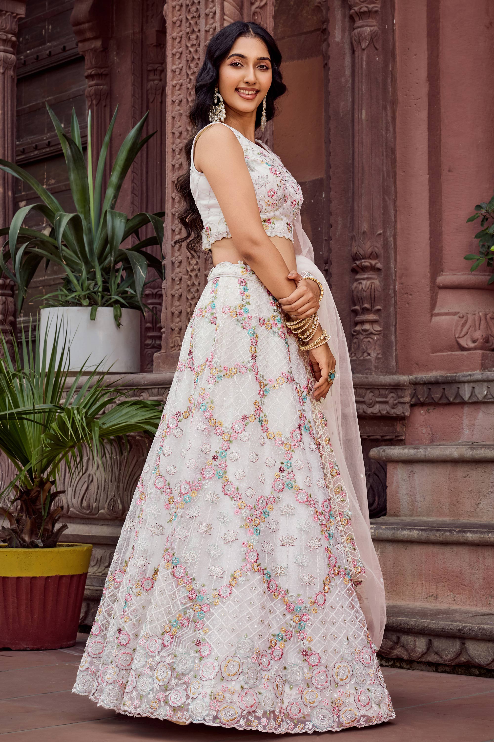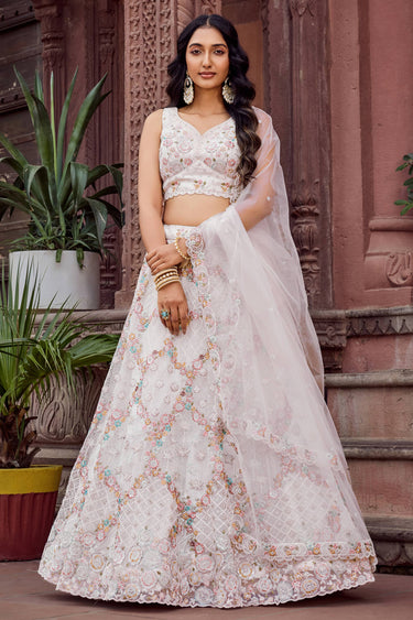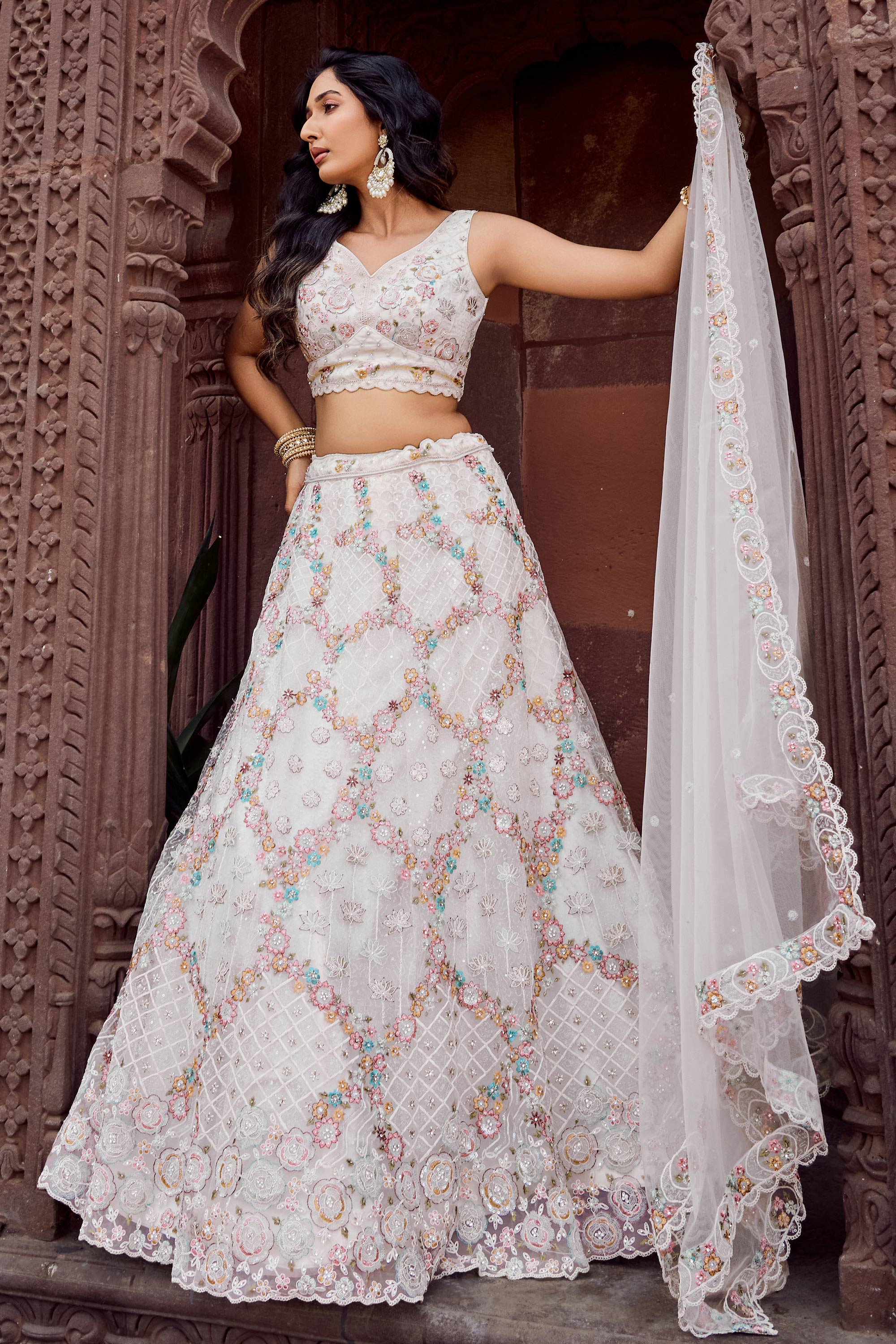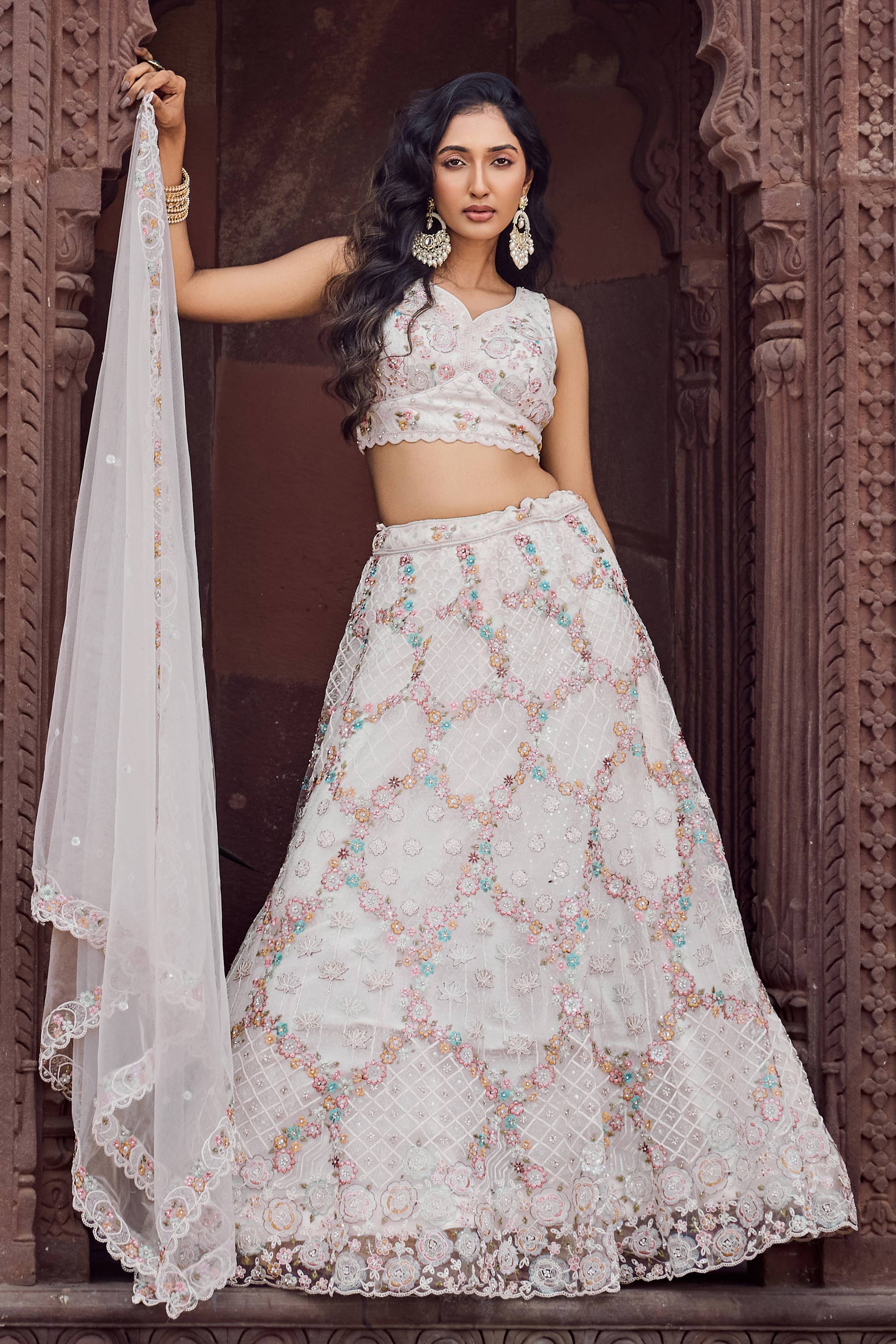 Off White Wedding Wear Embroidered Net Fabric Lehenga Choli