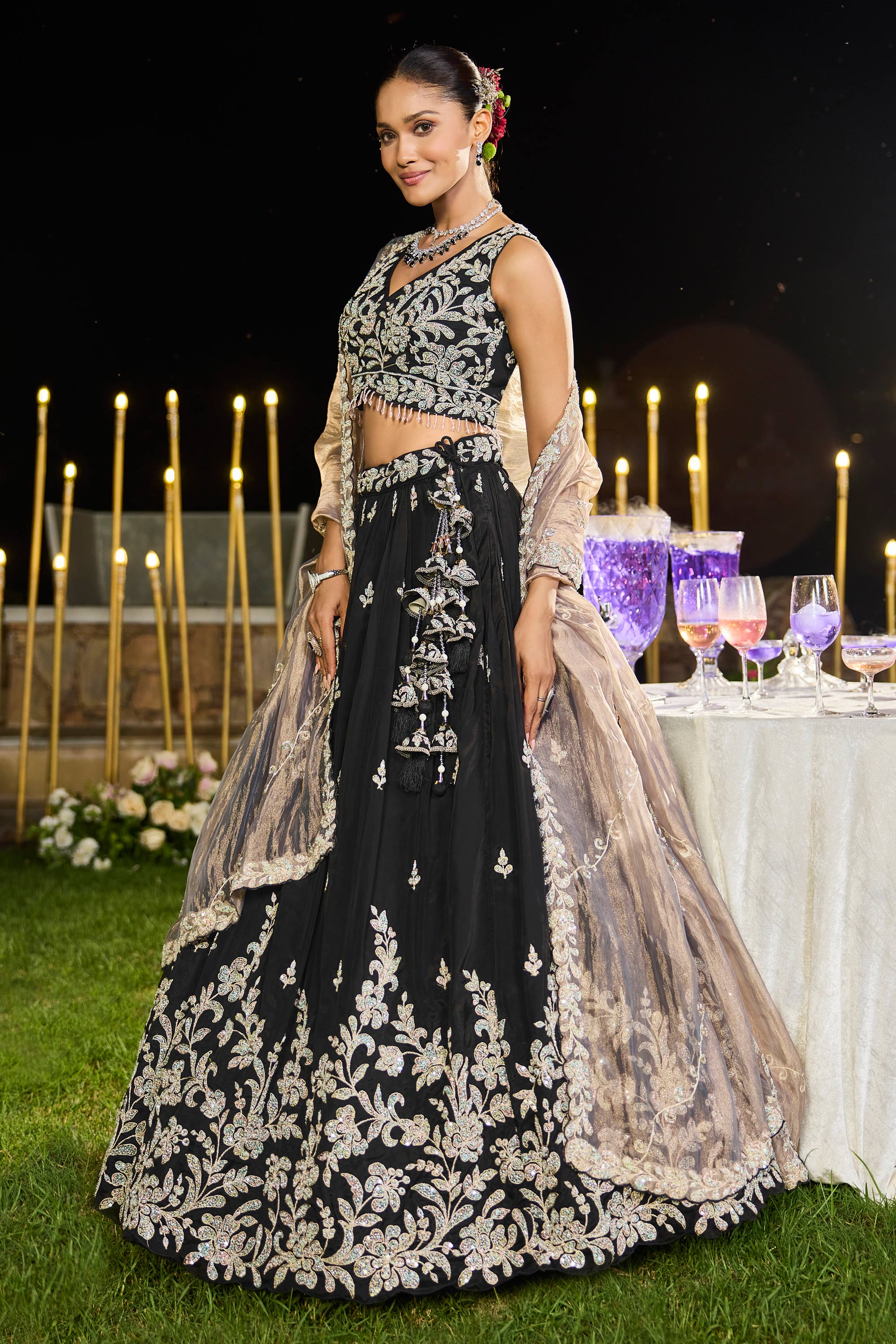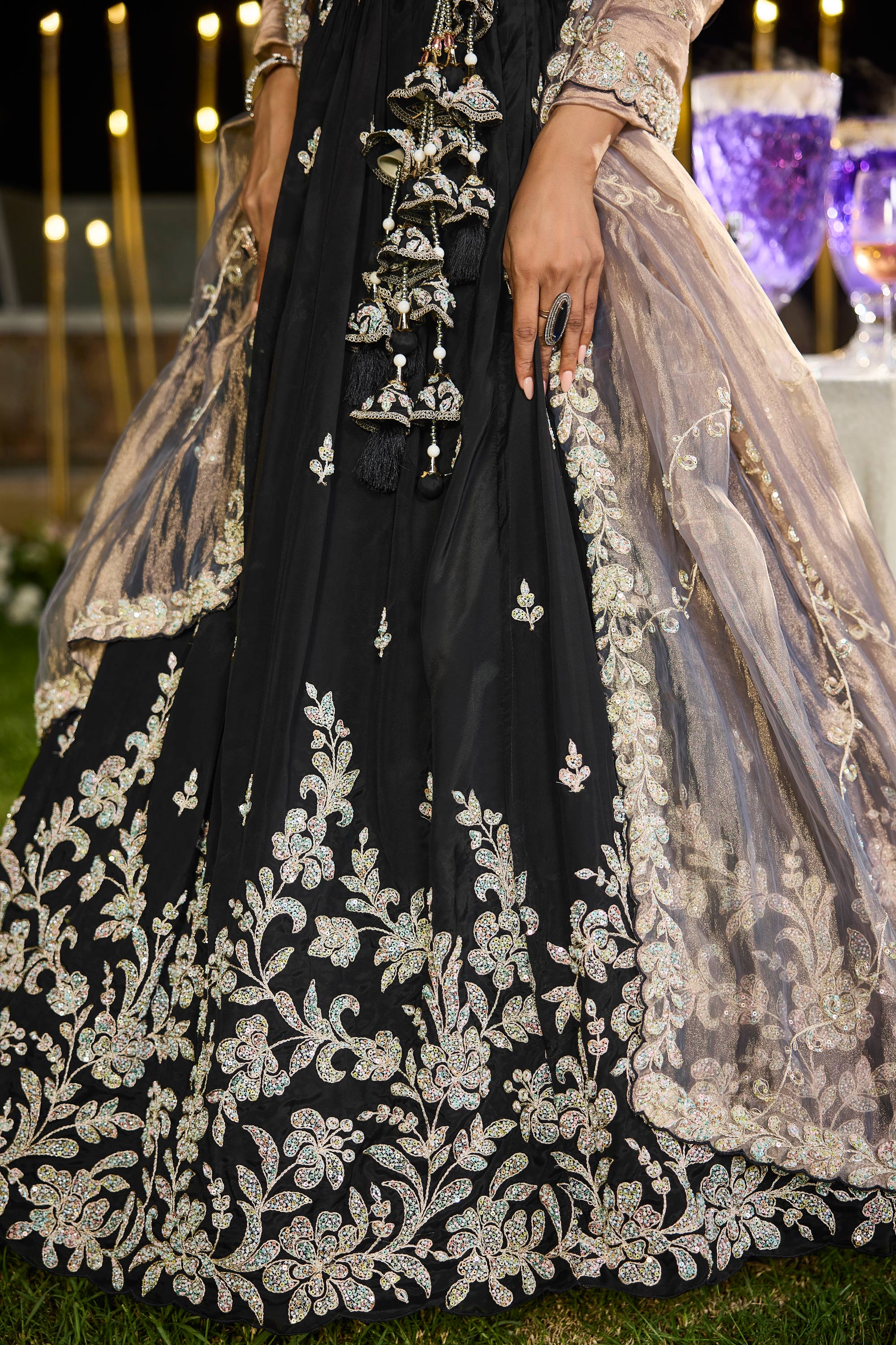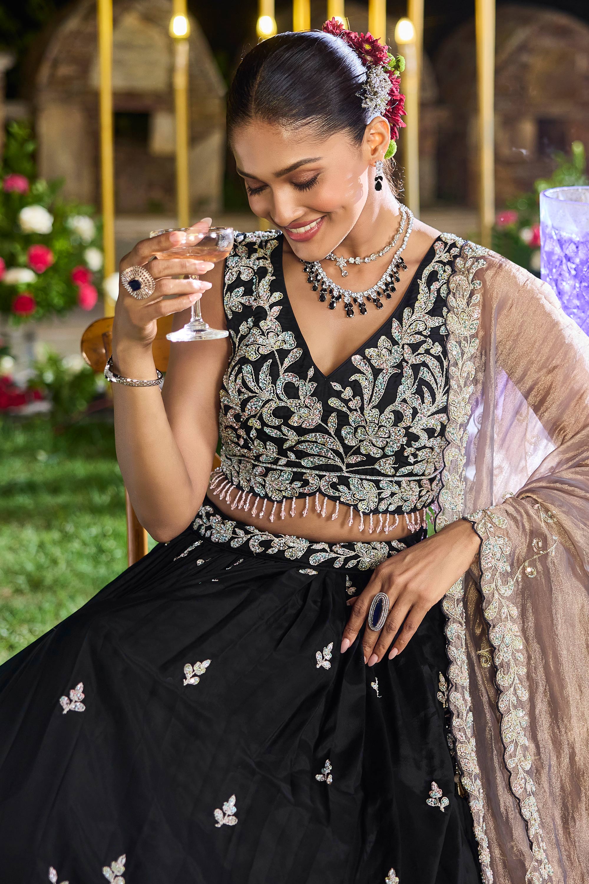 Satin Silk Embroidered Black Lehenga Choli For Wedding Wear