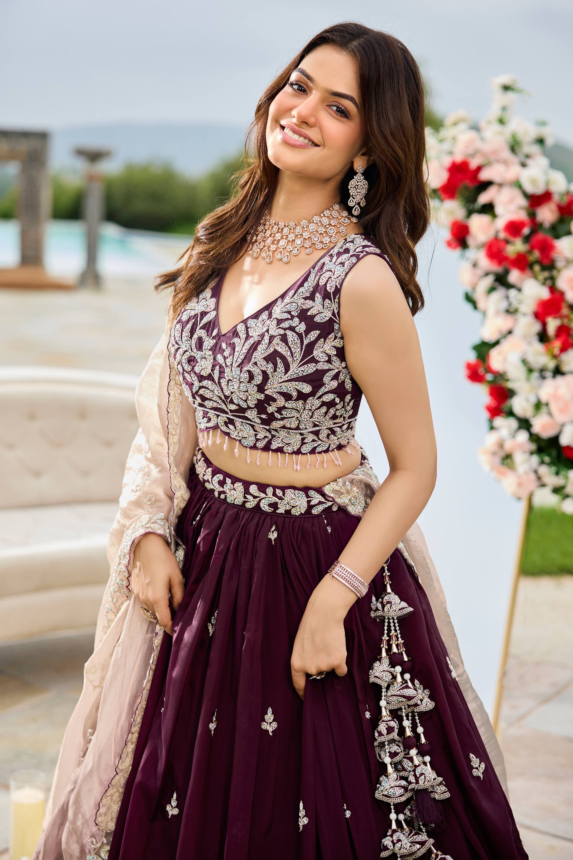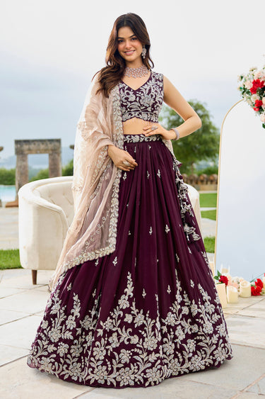 Satin Silk Embroidered Wine Wedding Wear Readymade Lehenga Choli