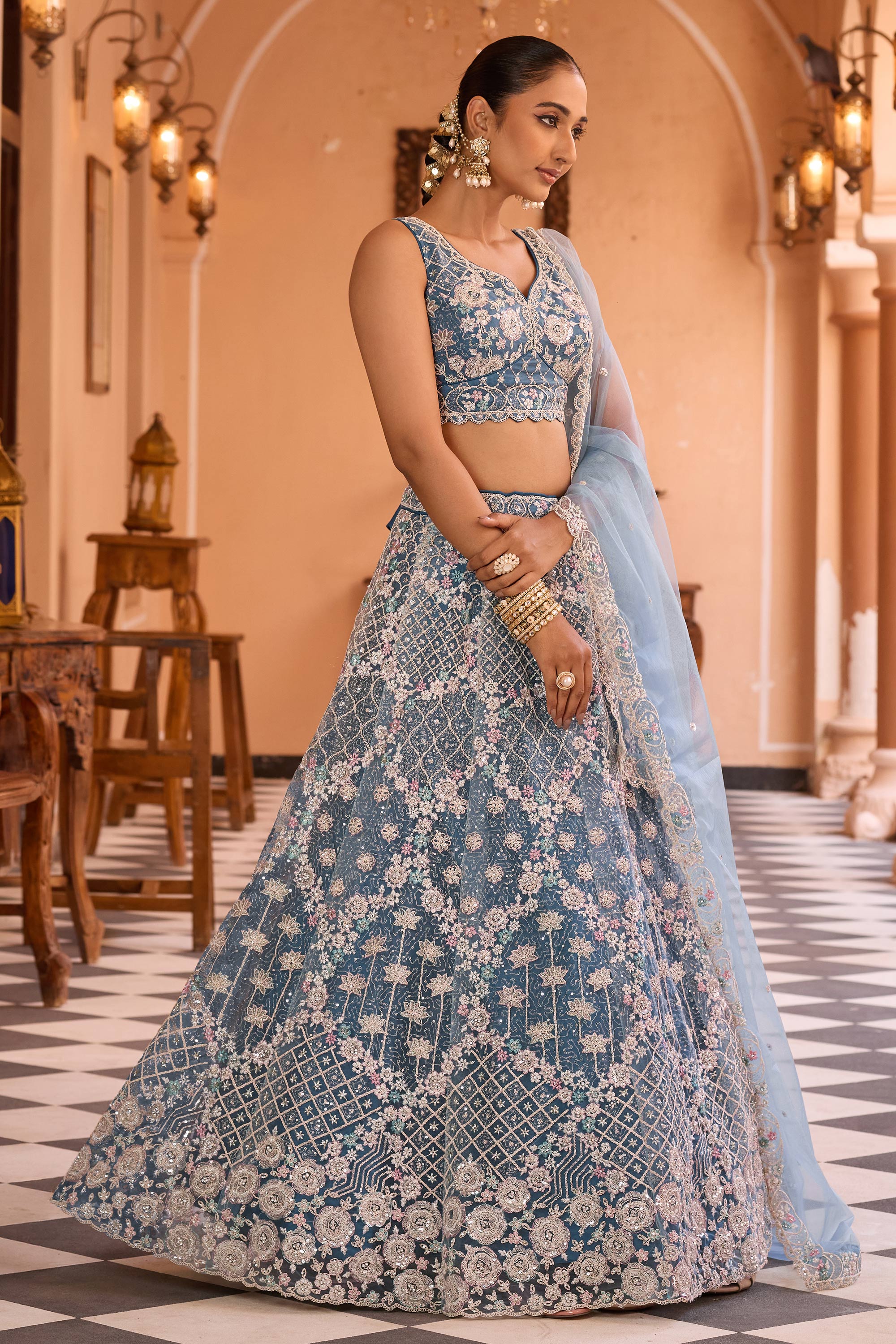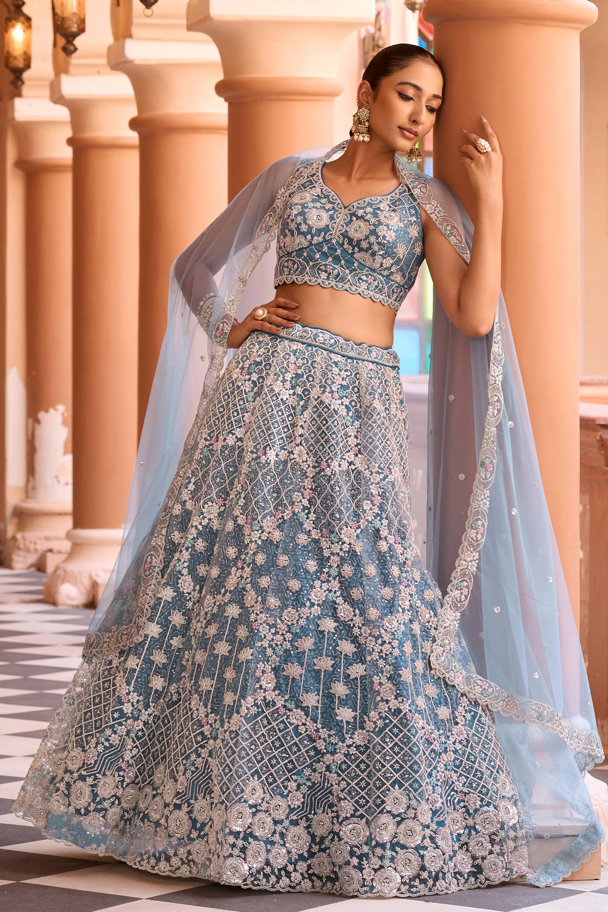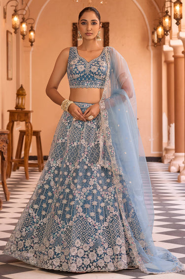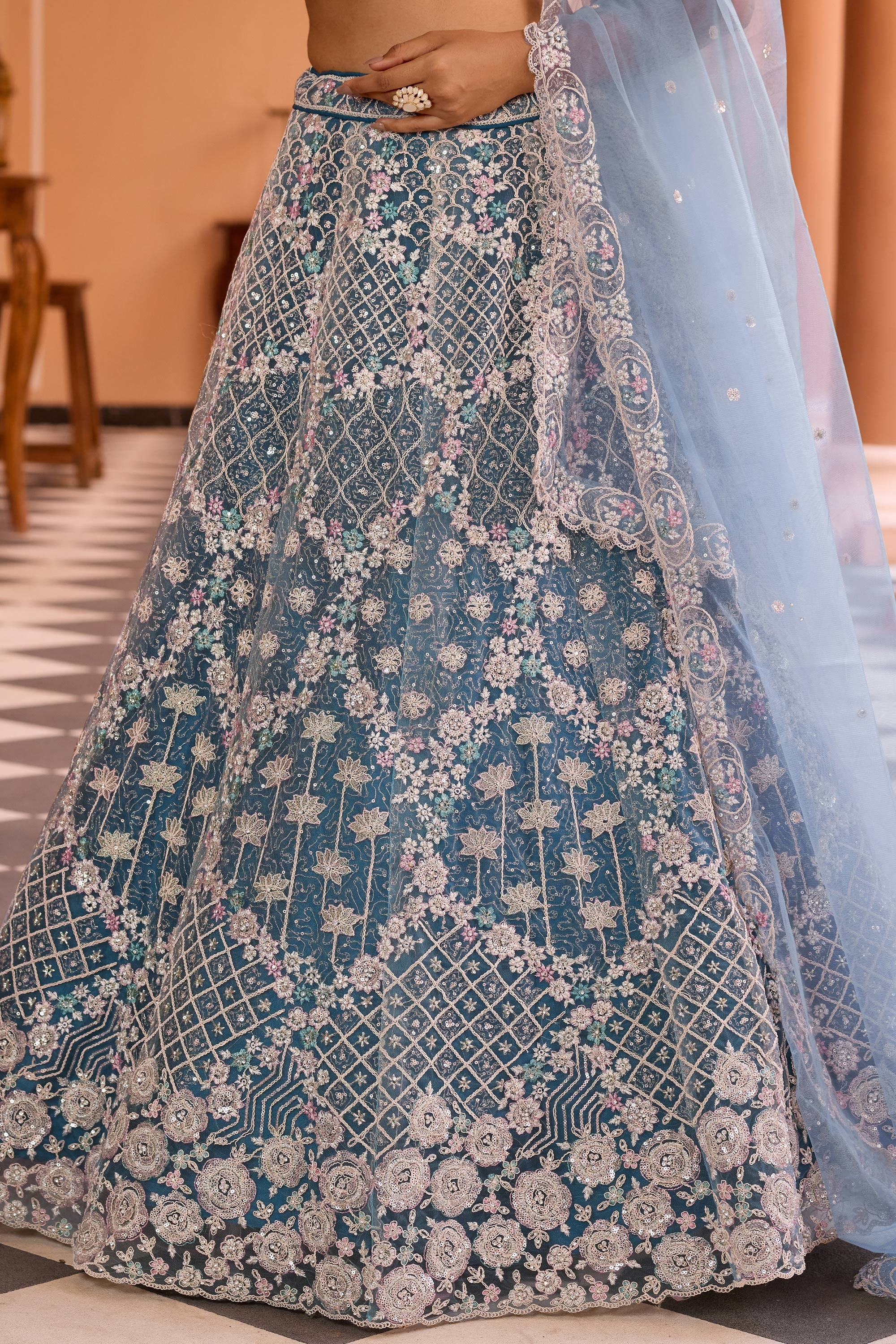 Teal Embroidered Net Fabric Wedding Wear Lehenga Choli With Dupatta