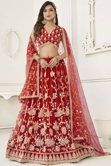 Embroidered Net Wedding Wear Lehenga In Red With Ravishing Blouse