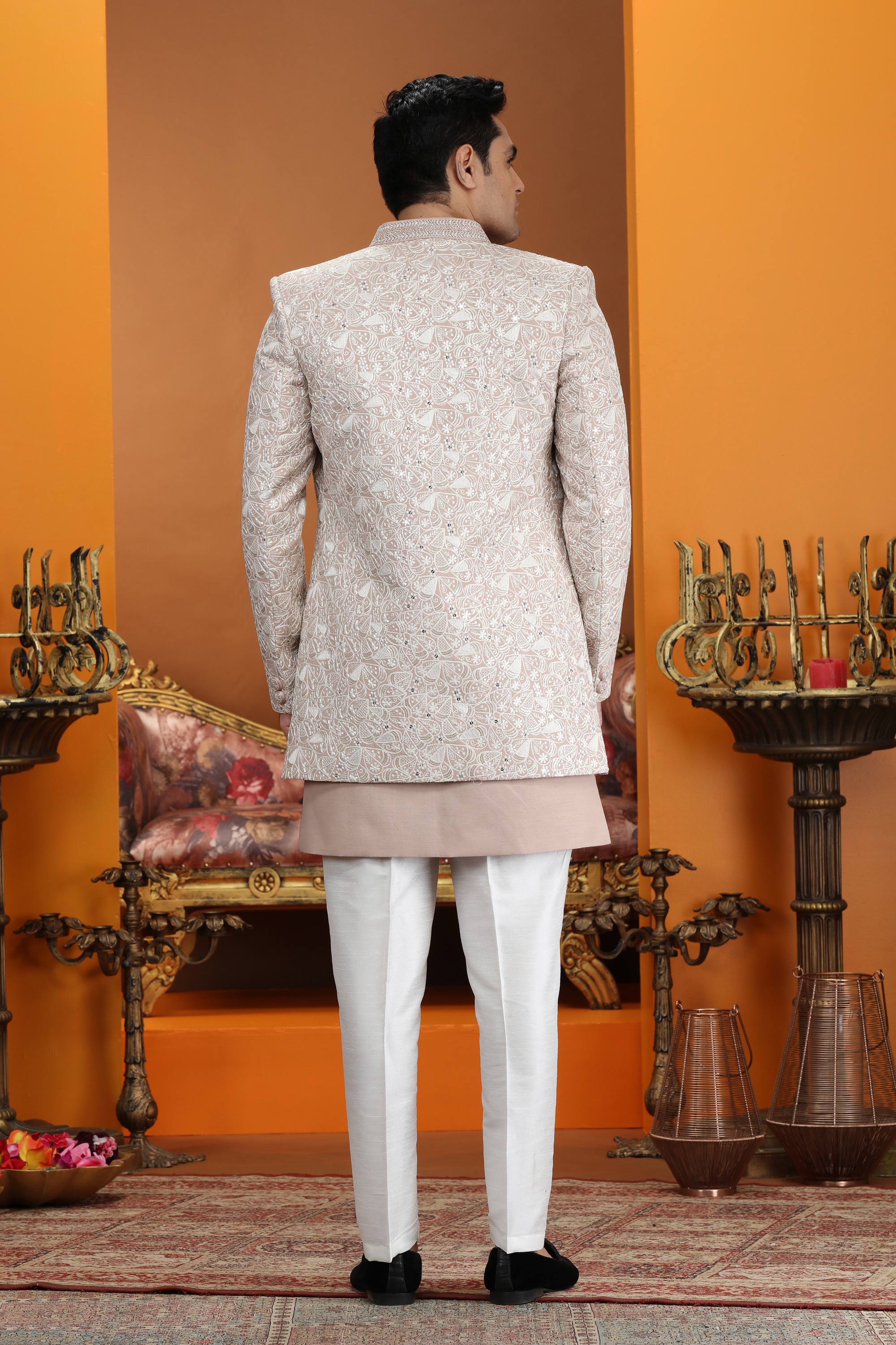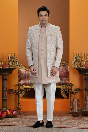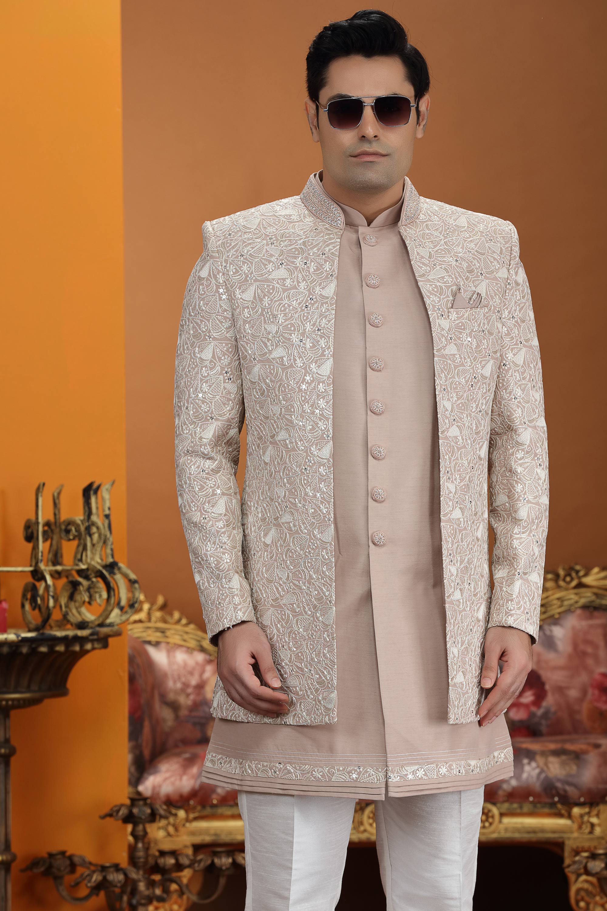 The bottom is crafted from Dupion art silk and tailored in a classic Aligadhi pant style, offering both comfort and a traditional silhouette. A smooth faux satin lining ensures a comfortable fit throughout long wedding celebrations. The finely detailed embroidery on the jacket enhances the overall grandeur of the outfit. Due to digital photography, slight color variations may occur.
