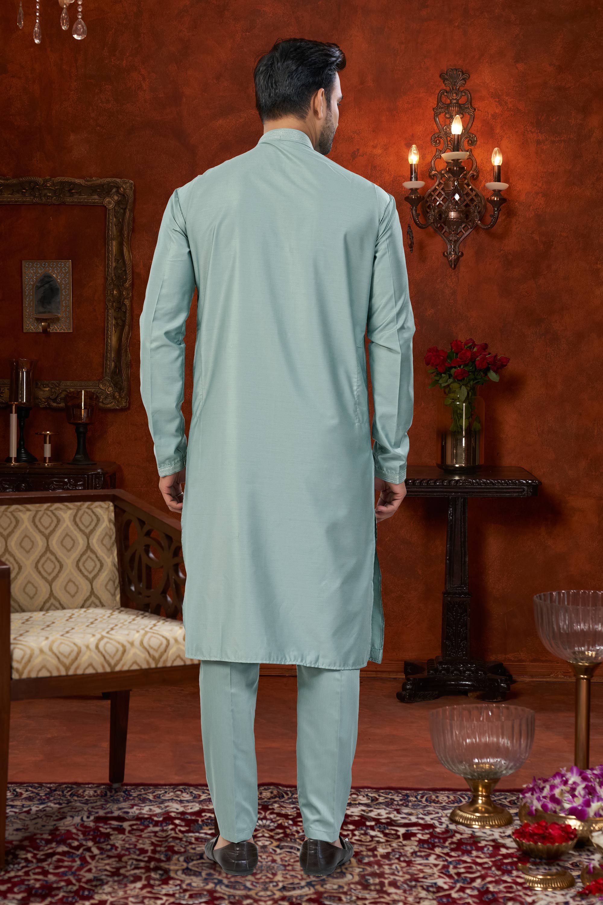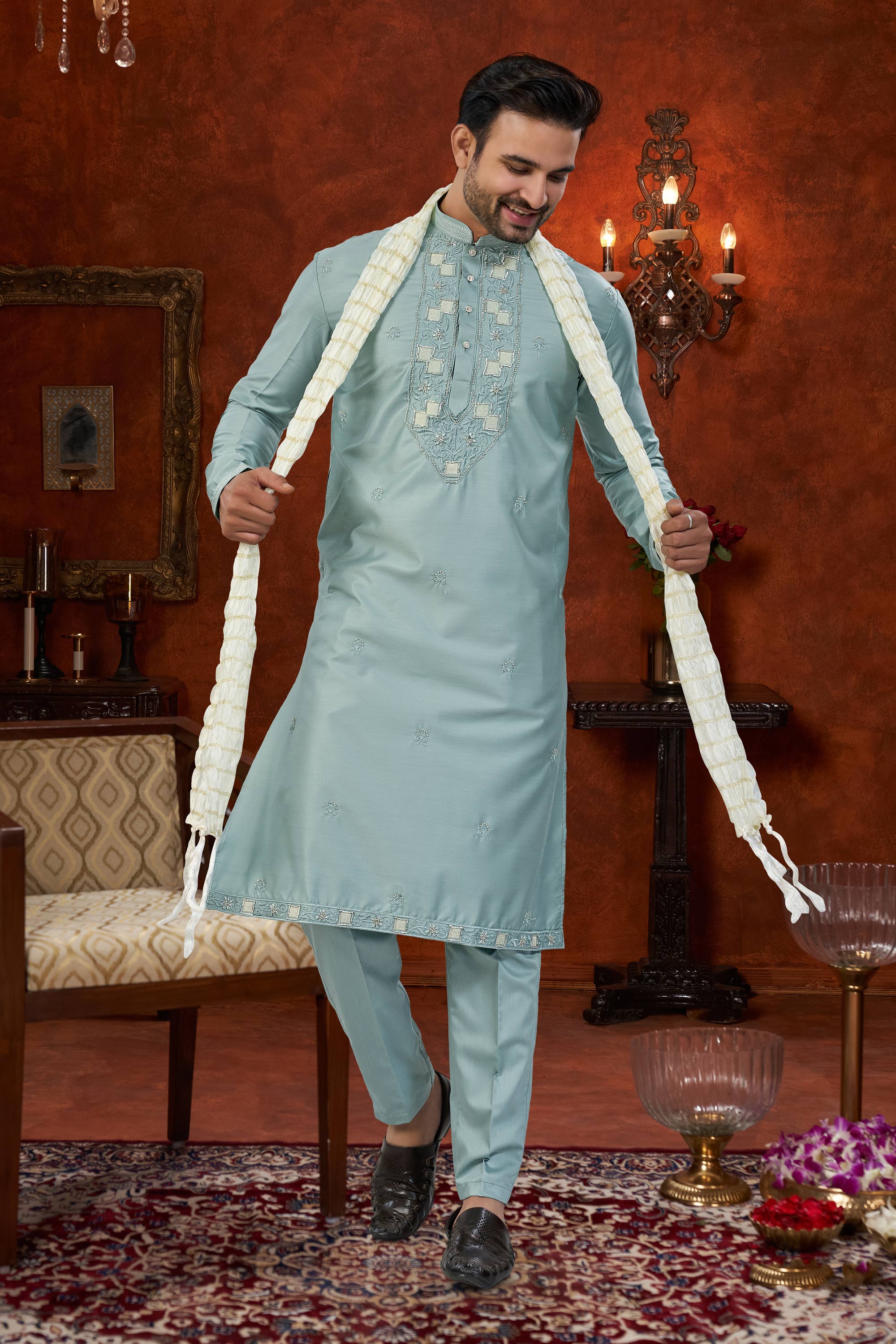 Art Silk Cyan Wedding Wear Readymade Kurta Pyjama For Men