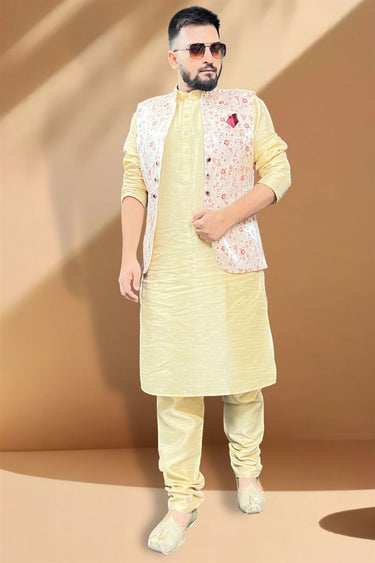 Engaging Function Wear Silk Fabric Cream Kurta Pyjama With Cream Color Jacket