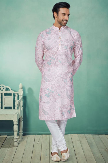 Fancy Fabric Function Wear Readymade Pink Color Printed Kurta Pyjama For Men