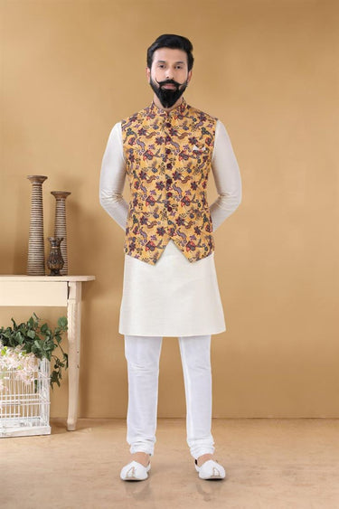 Glamorous Off White Color Art Silk Fabric Function Wear Fancy Readymade Kurta Pyjama With Jacket