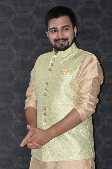Radiate confidence in our rich Reach color Reception Wear, fashioned in Modi-inspired Art Silk Fabric for men. Be the epitome of style, elegance, and grace at your upcoming event. Perfect for the modern man who wants an effortless combination of tradition and fashion. Ready-to-wear for your convenience! Experience the luxury of Art Silk and upgrade your wardrobe today!