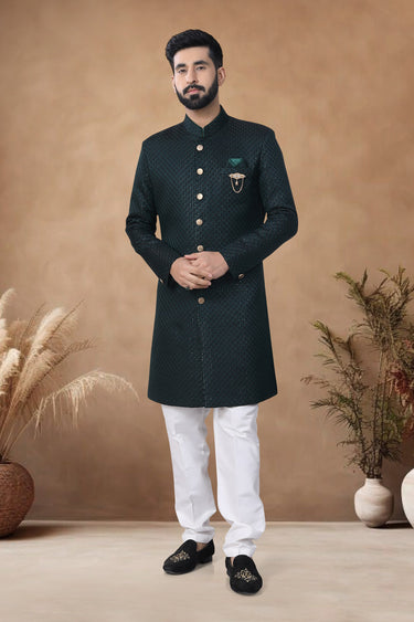 Green Stunning Jacquard Wedding Wear Readymade Indo Western For Men