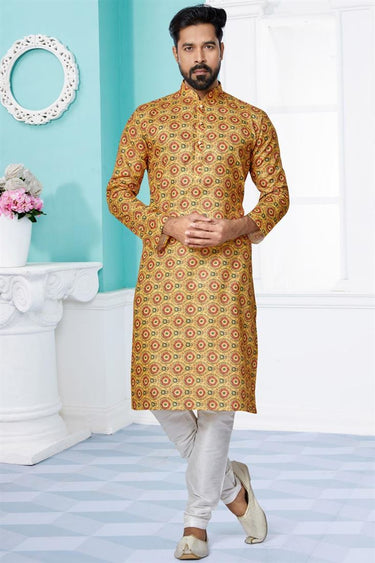 Mustard Color Fancy Fabric Festive Wear Captivating Printed Readymade Kurta Pyjama For Men