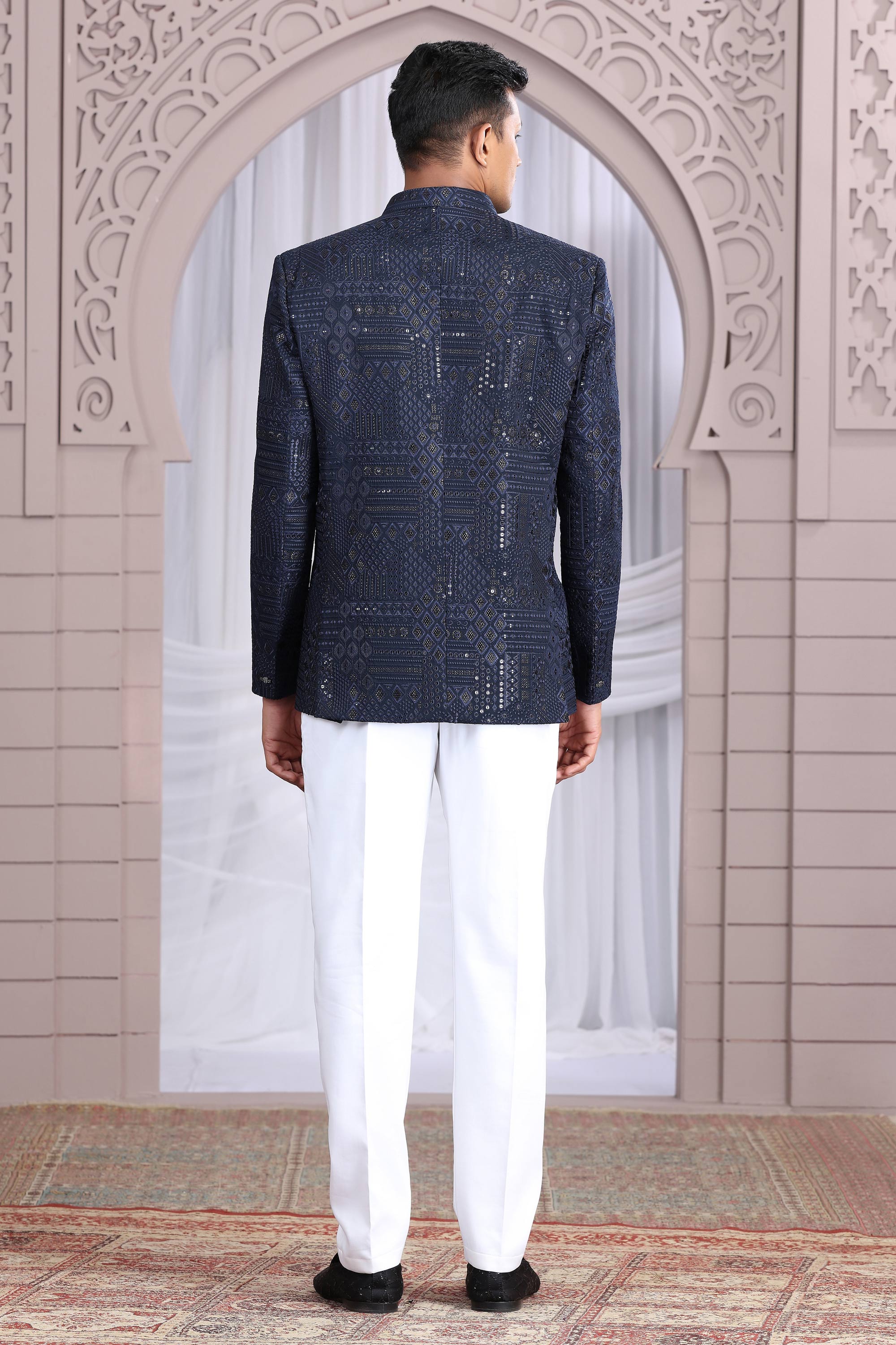 Navy Blue Art Silk Readymade Men Indo Western Jodhpuri Suit
