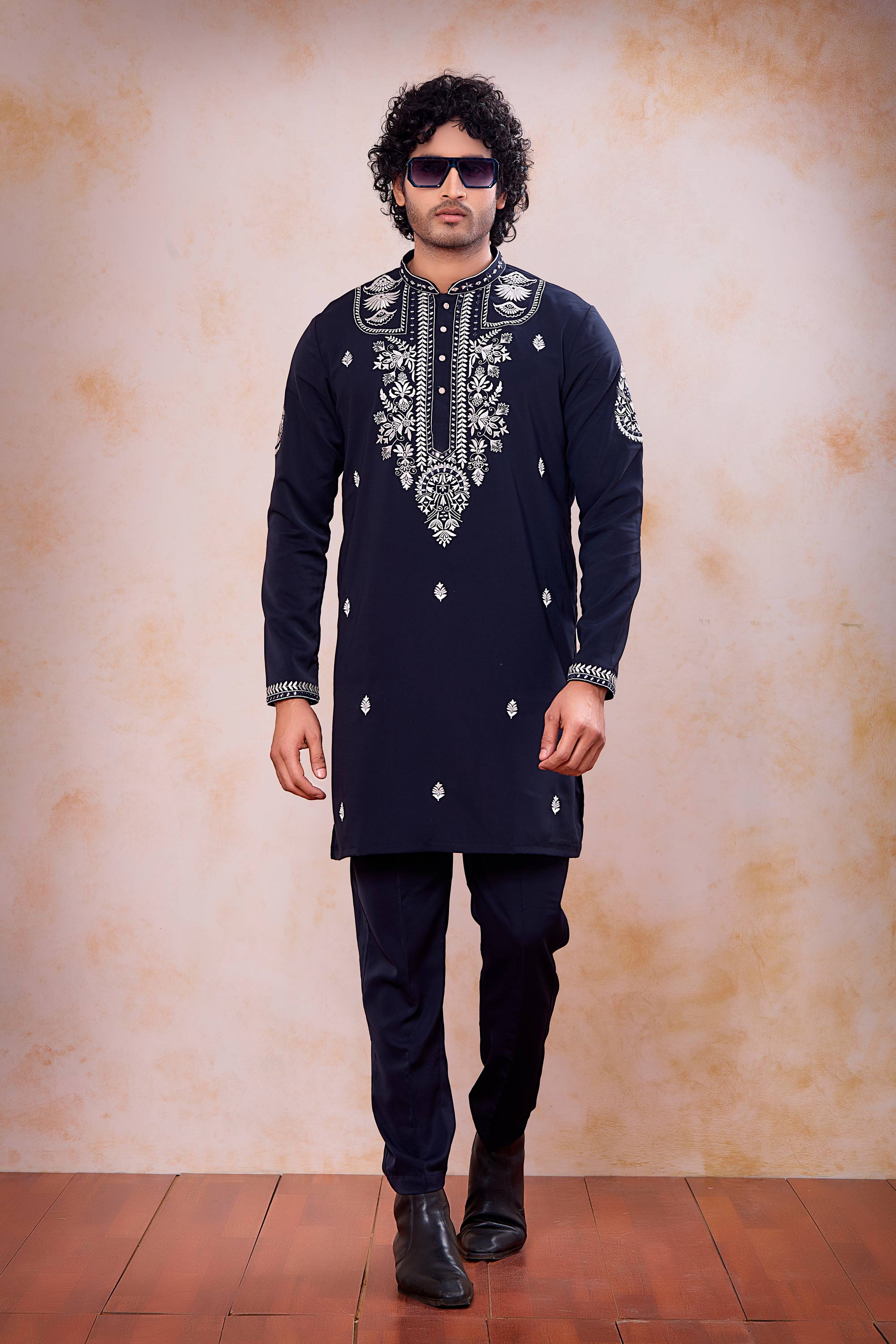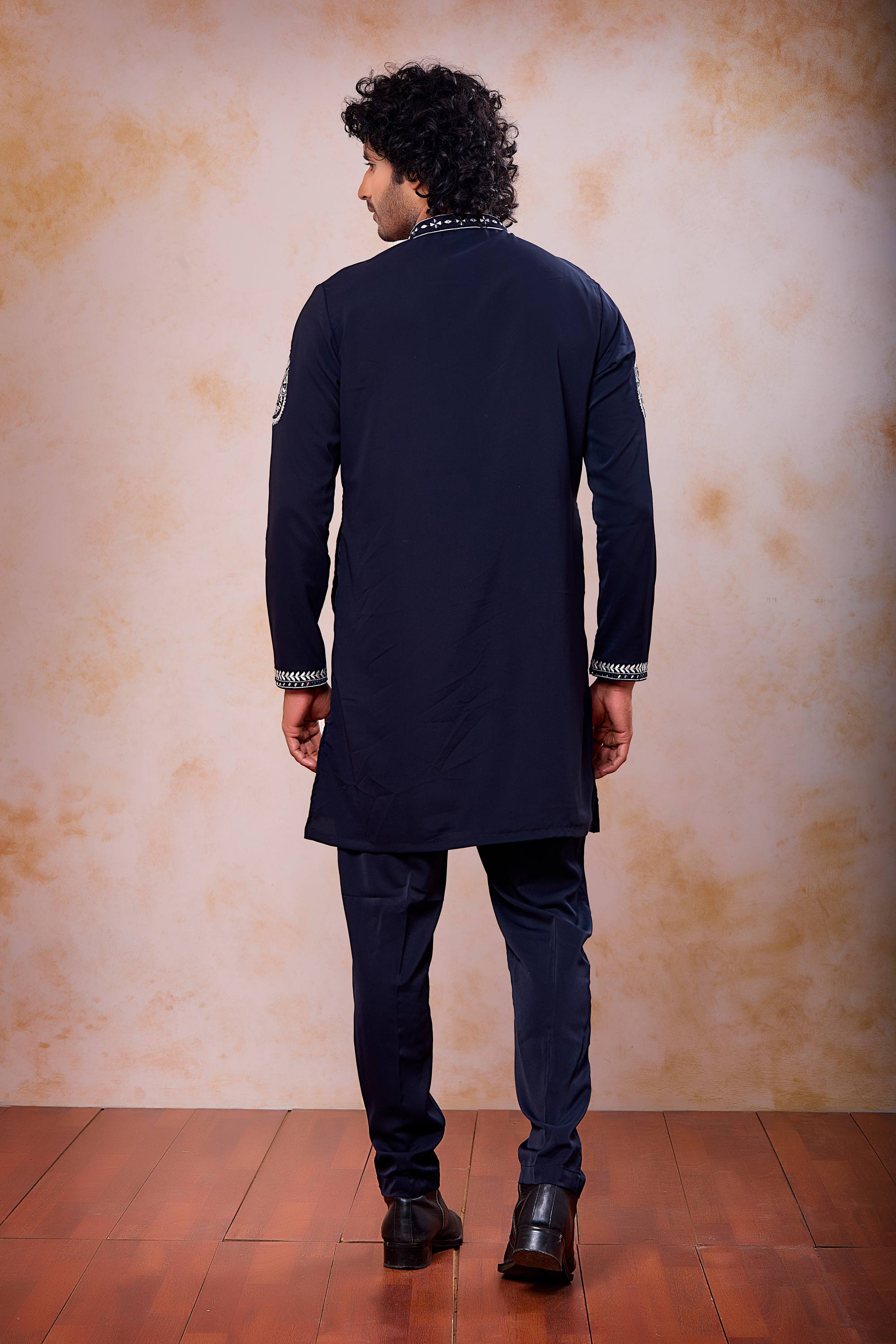 Navy Blue Wedding Wear Fancy Fabric Embroidered Readymade Kurta With Aligadhi Pant For Men