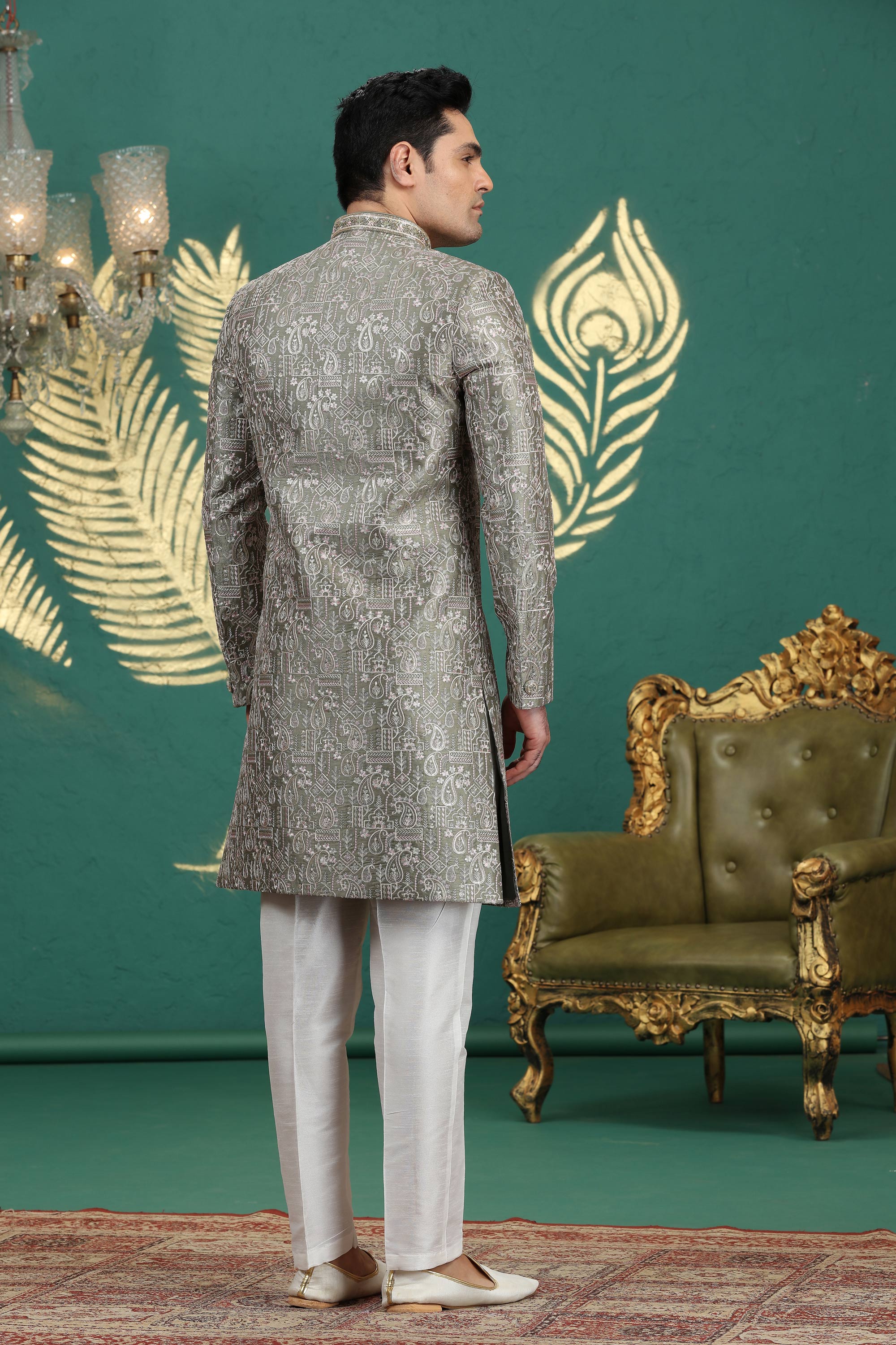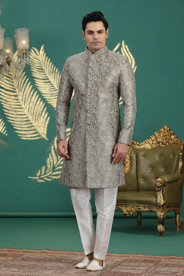 Crafted for a modern groom with a touch of traditional charm, this ivory sherwani features exquisite embroidery and rich detailing. Made with high-quality materials, it ensures comfort while maintaining a sophisticated look. Perfect for weddings, receptions, or formal ceremonies, this sherwani enhances your style with a blend of cultural heritage and contemporary flair. Comes with a coordinating churidar to complete the outfit. Make your special day unforgettable with this ready-to-wear masterpiece.