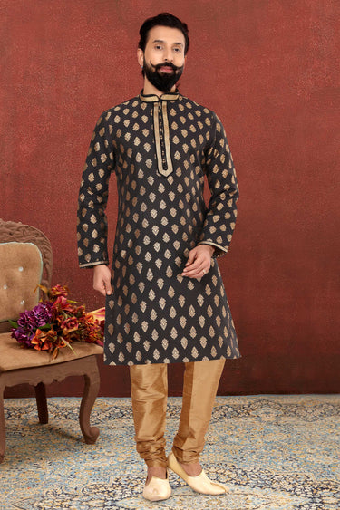 Reception Wear Attractive Kurta Pyjama For Men In Black Color Jacquard Silk Fabric