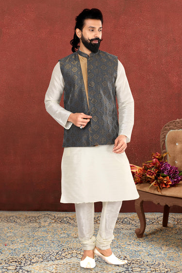 White Color Beautiful Dhupion Silk Fabric Wedding Wear Readymade Kurta Pyjama For Men With Jacket