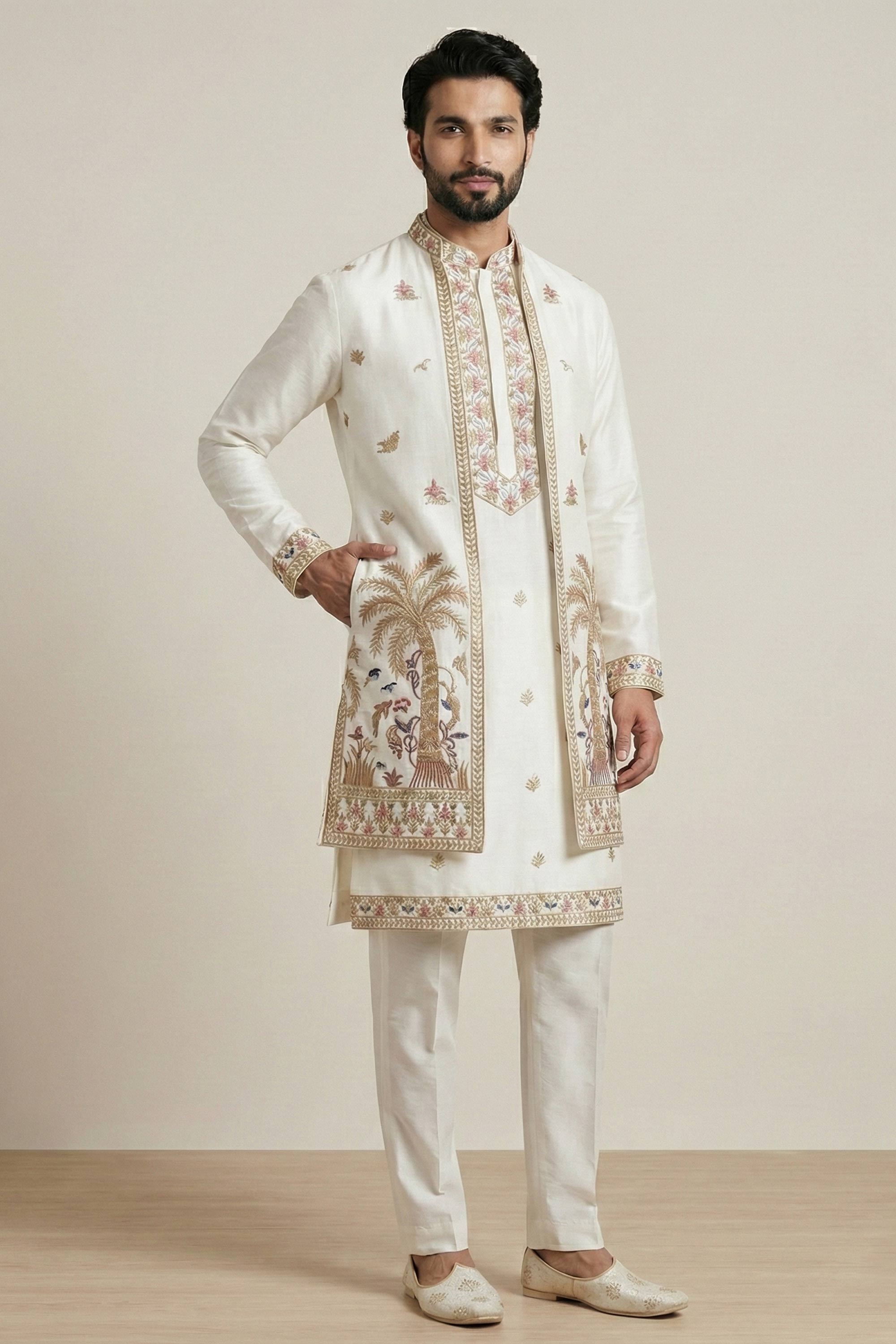 White Festive Wear Satin Embroidered Readymade Kurta Pyjama With Jacket For Men