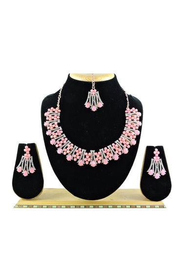 Alloy Material Pink Color Elegant Necklace With Earrings and Mang Tikka