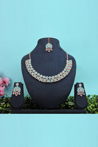 Excellent Alloy Material Cyan Color Necklace Set Earrings And Mang Tikka For Women