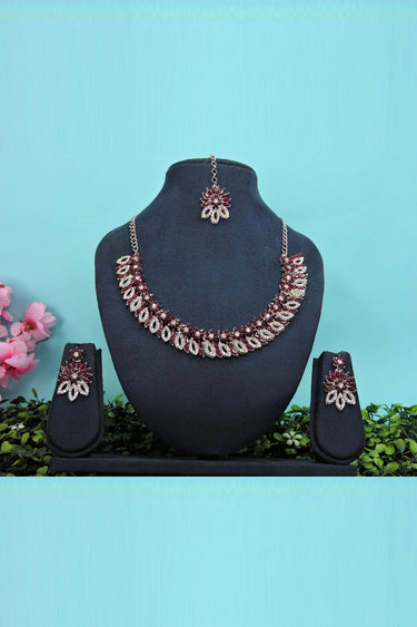 Mesmeric Maroon Color Necklace Set Earrings And Mang Tikka For Women In Alloy Material