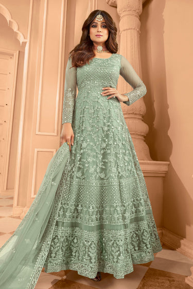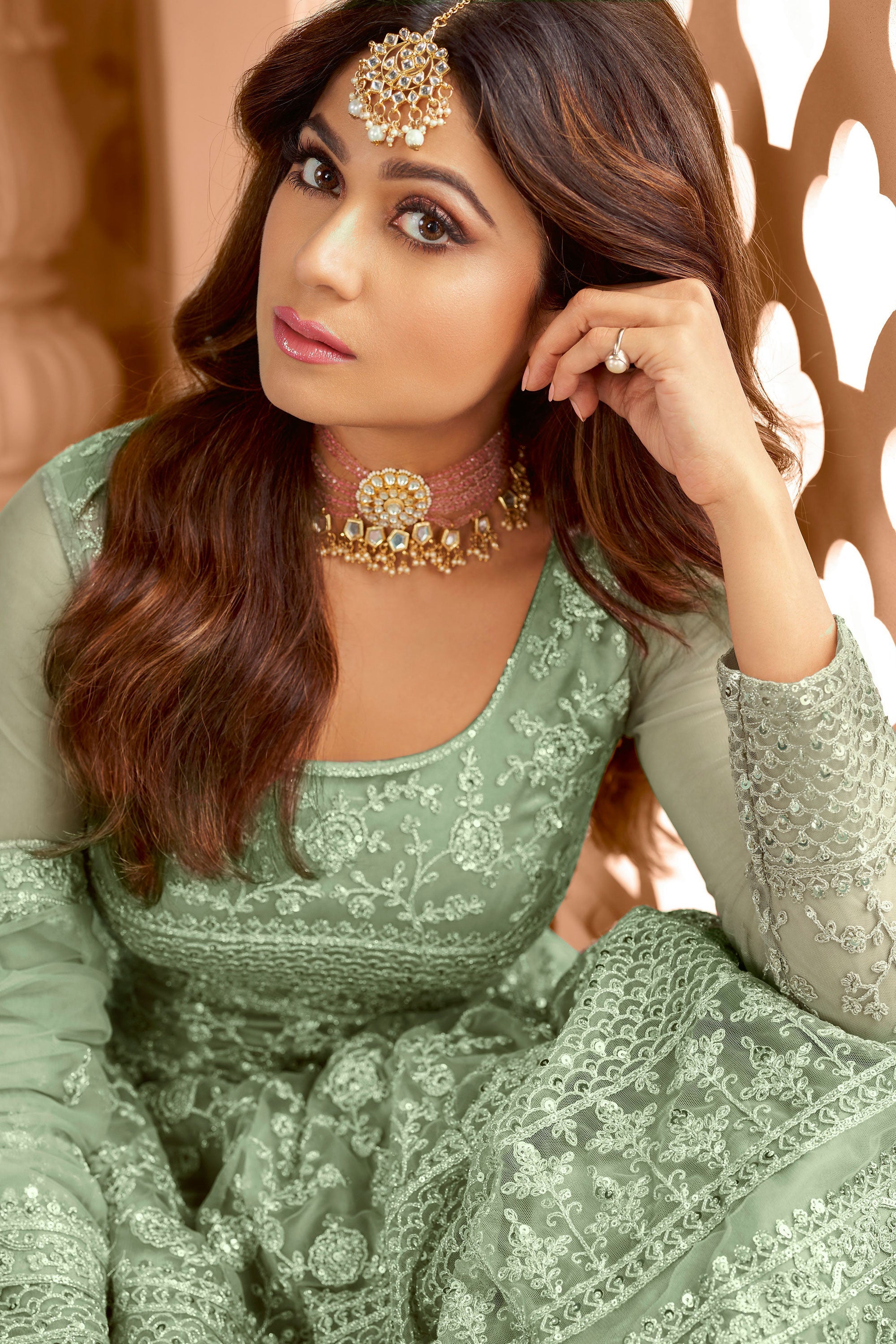 Shamita Shetty Net Sea Green Designer Anarkali Salwar Suit