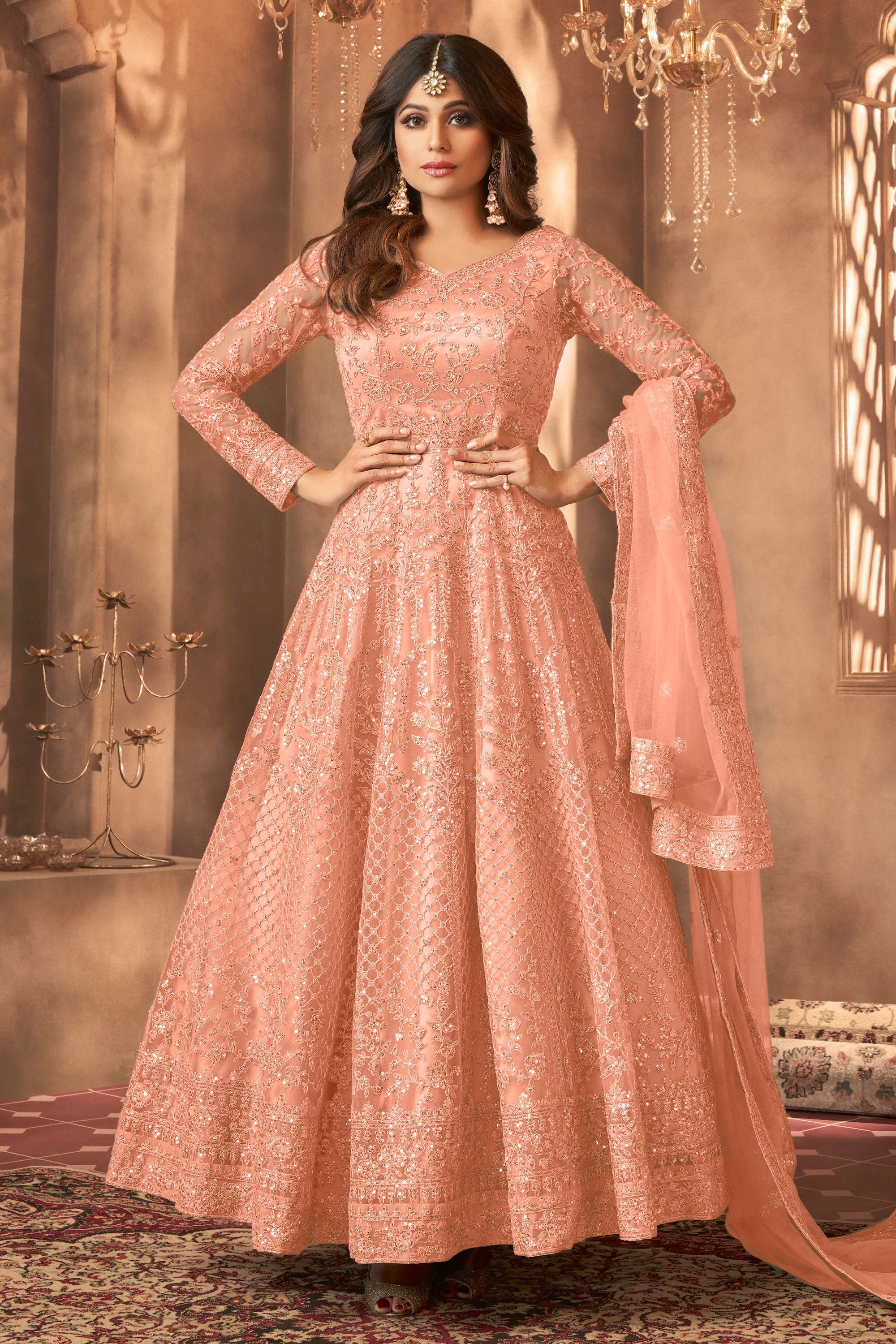 Shamita Shetty Peach Net Embroidered Floor Length Anarkali Salwar Suit
