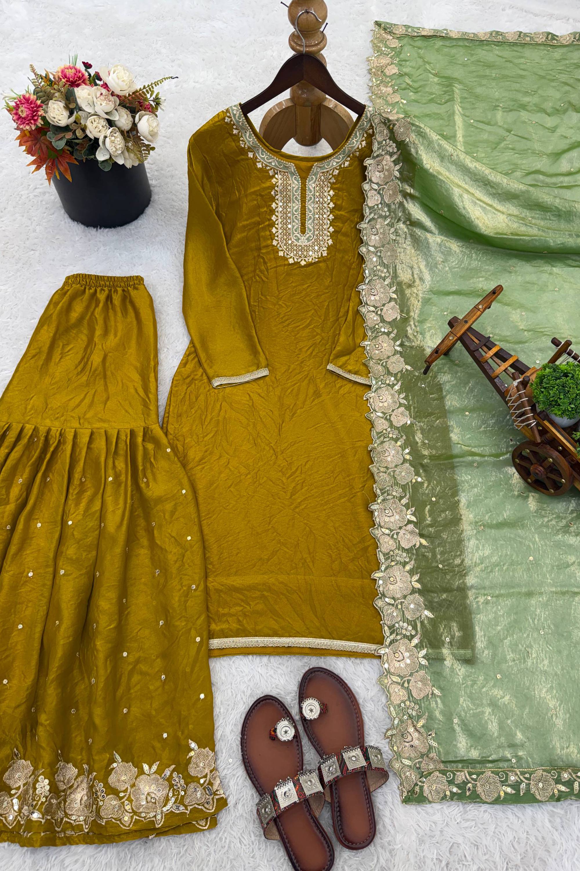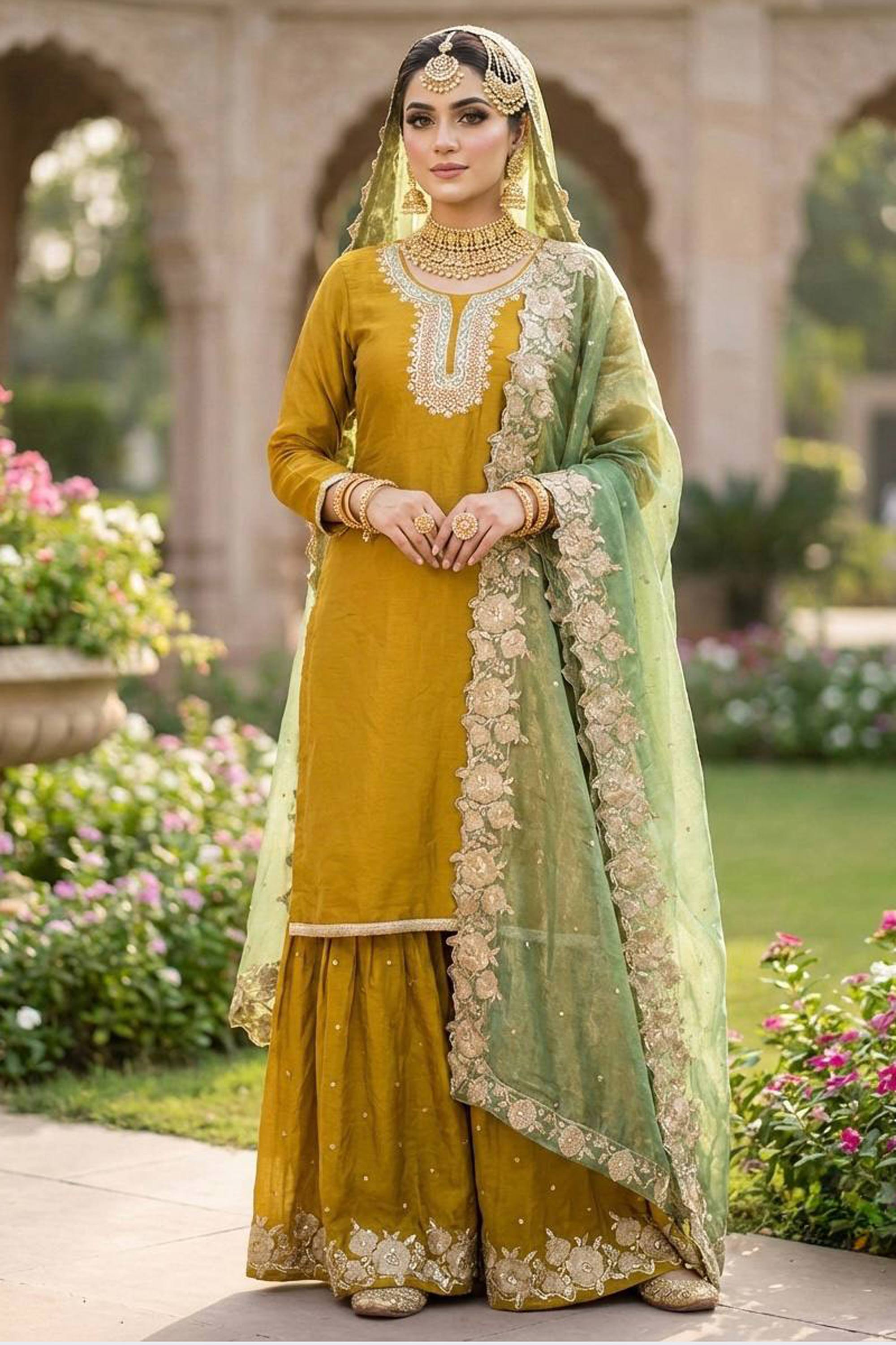 Art Silk Embroidered Mustard Readymade Palazzo Suit For Festive Wear
