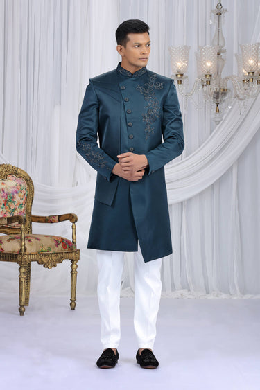 Elevate your festive attire with this elegant Embroidered Work Designer Wedding Function Readymade Men Indo Western with Aligadhi Pant. Featuring finely crafted embroidery and superior-quality fabric, this outfit promises both style and comfort. The pre-stitched design guarantees convenience, while the detailed artistry adds a refined finish. Its timeless silhouette suits weddings, engagements, and traditional functions, helping you make an unforgettable impression. Designed for men who appreciate attention to detail, this ensemble effortlessly captures a blend of tradition and modernity.